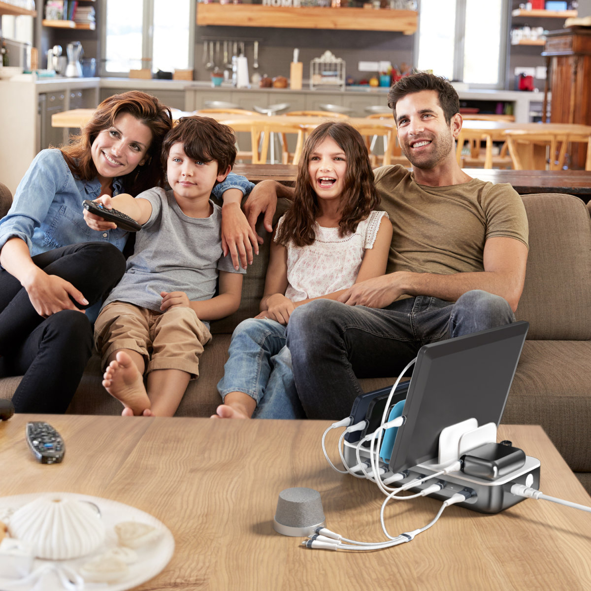 The multi-charging station comes complete with five high-quality USB-C cables and a 4in2 multi-charging cable. This flexible cable combines connections for USB-C, micro USB and Lightning and allows you to charge up to four different devices at the same time. The short cables (25 cm) save space and ensure organized use - ideal for any household or workplace. This makes the charging box the perfect tablet and cell phone charging station for everyone.