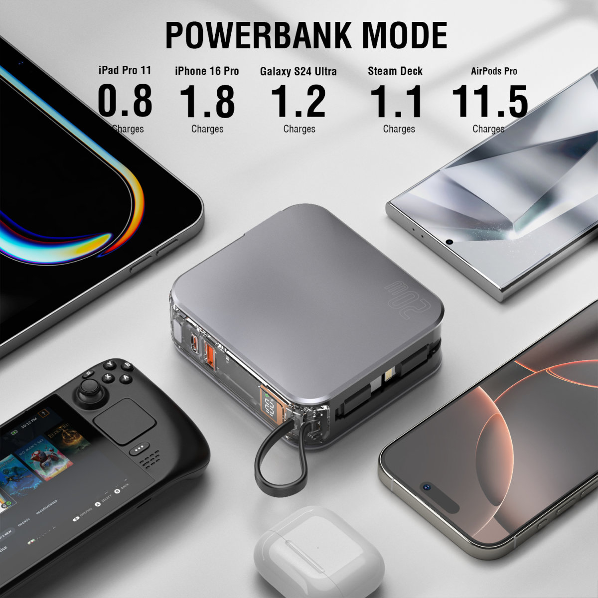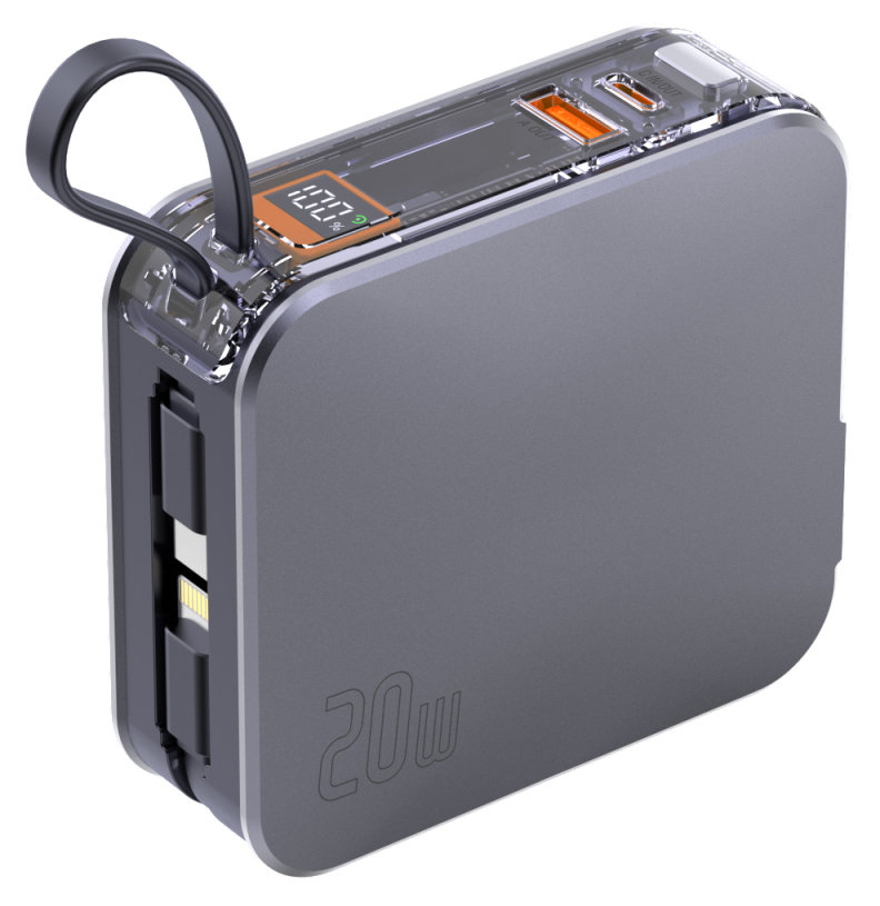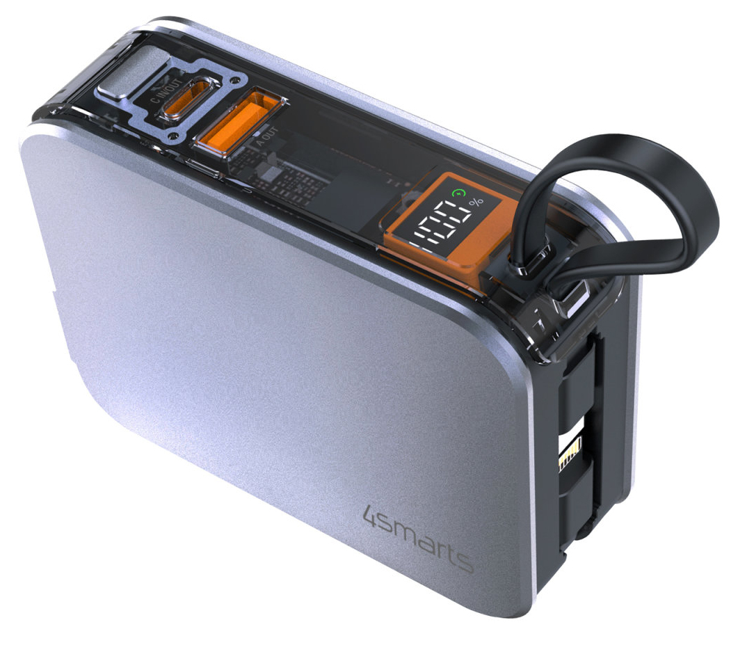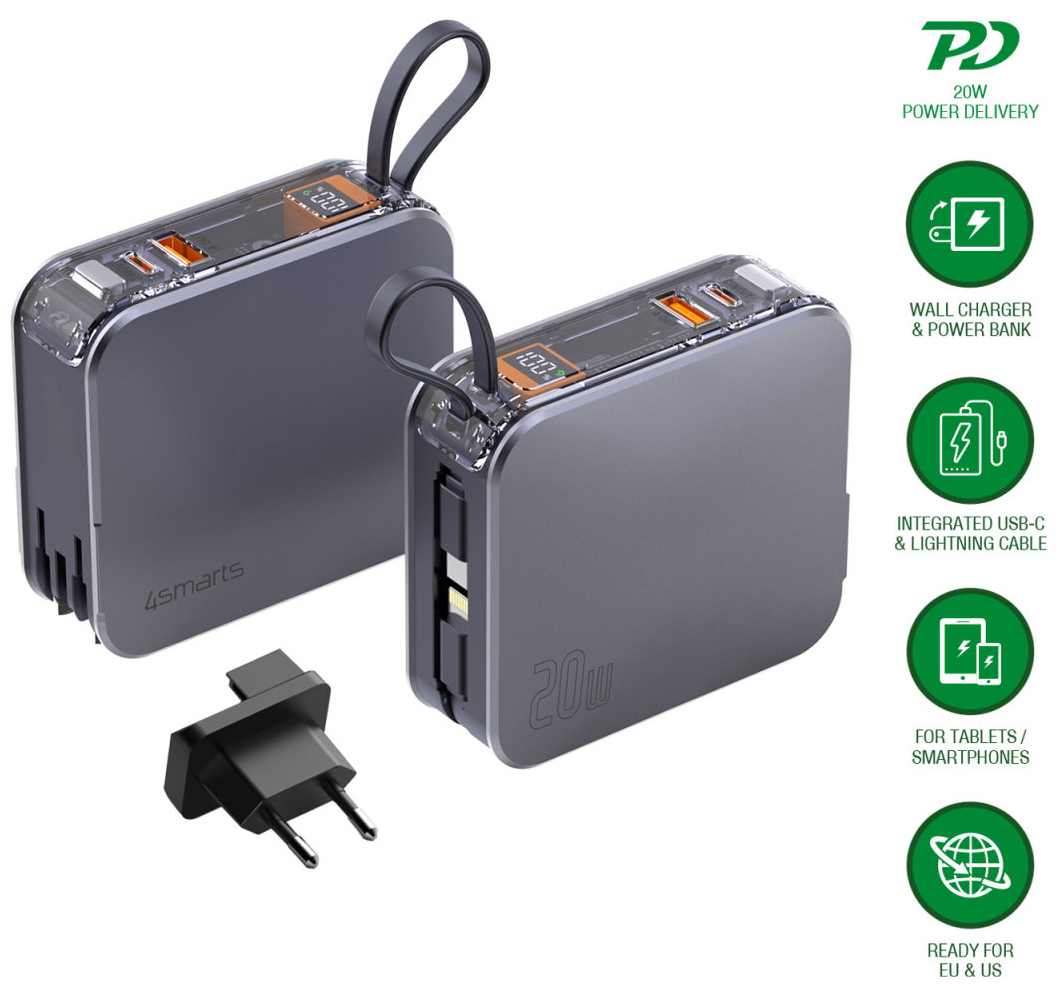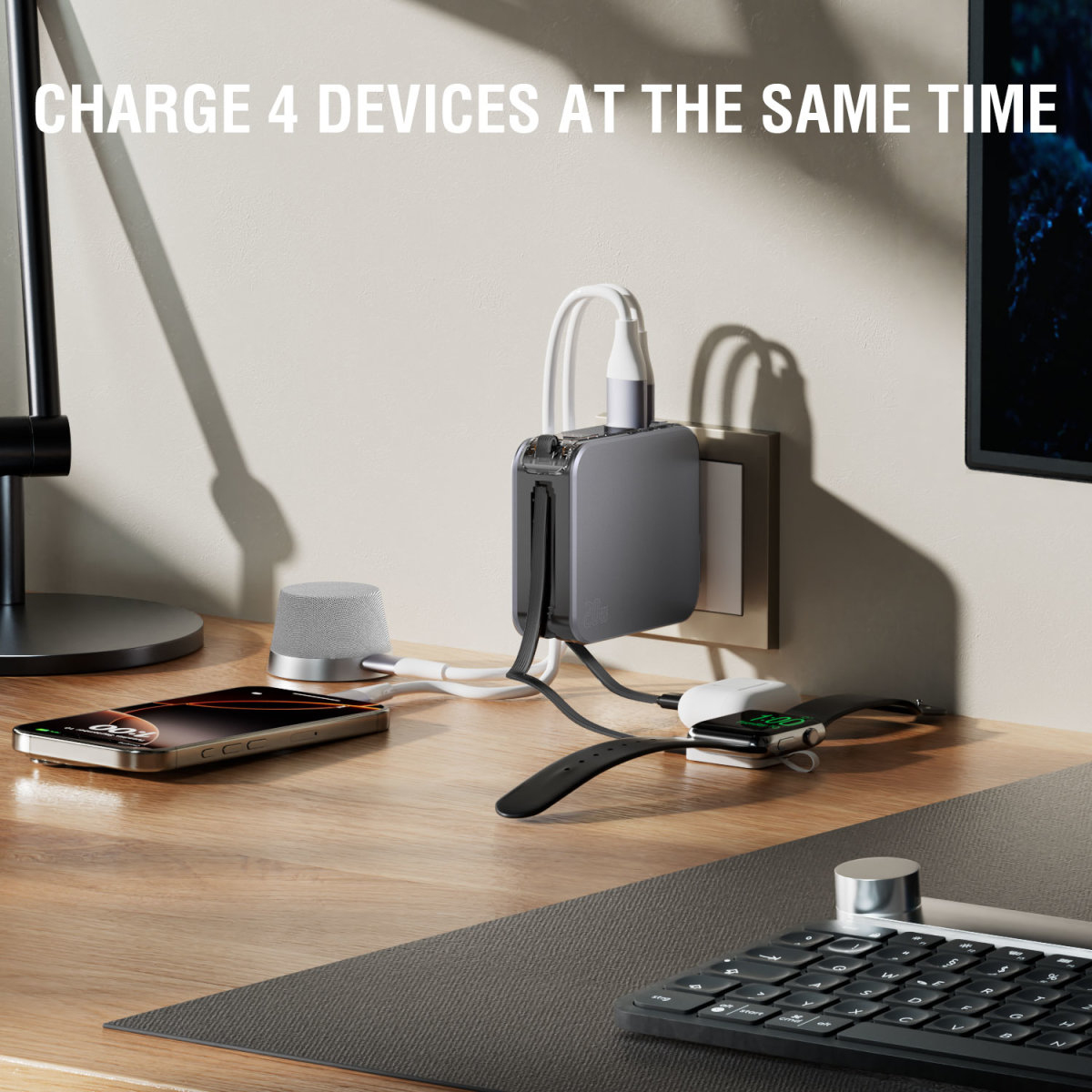 With four charging ports, this device offers maximum flexibility. Whether smartphone, tablet, headphones or smartwatch - everything can be charged with ease. The integrated USB-C and Lightning cables save you from having to carry additional cables, while the two USB ports (USB-C and USB-A) ensure that you can charge all devices at the same time. No more waiting and no more searching for a free port!