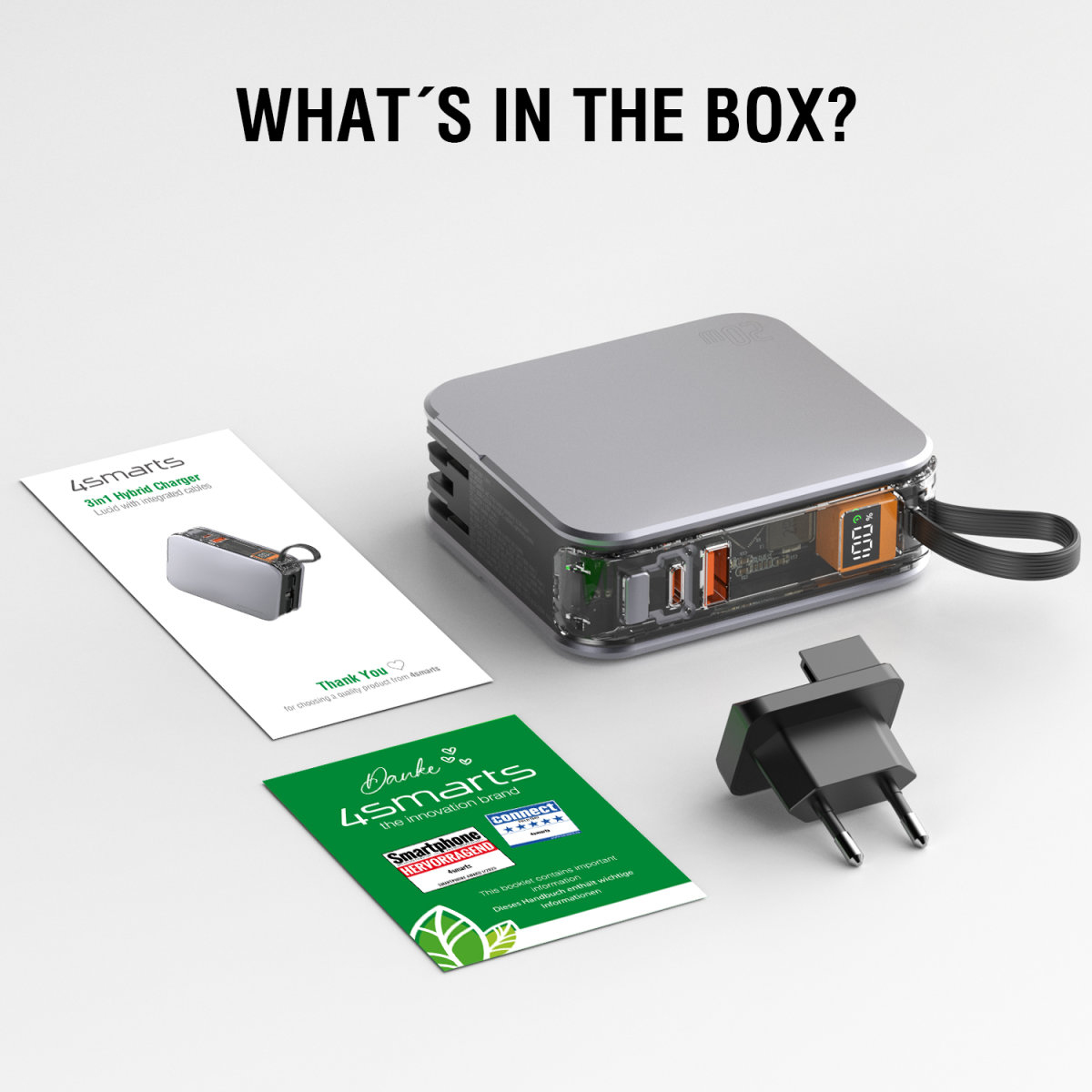 10000 mAh, 3in1 Hybrid Charger, Power Bank with integrated cables, silver, 18 x 9.5 x 3.5 cm