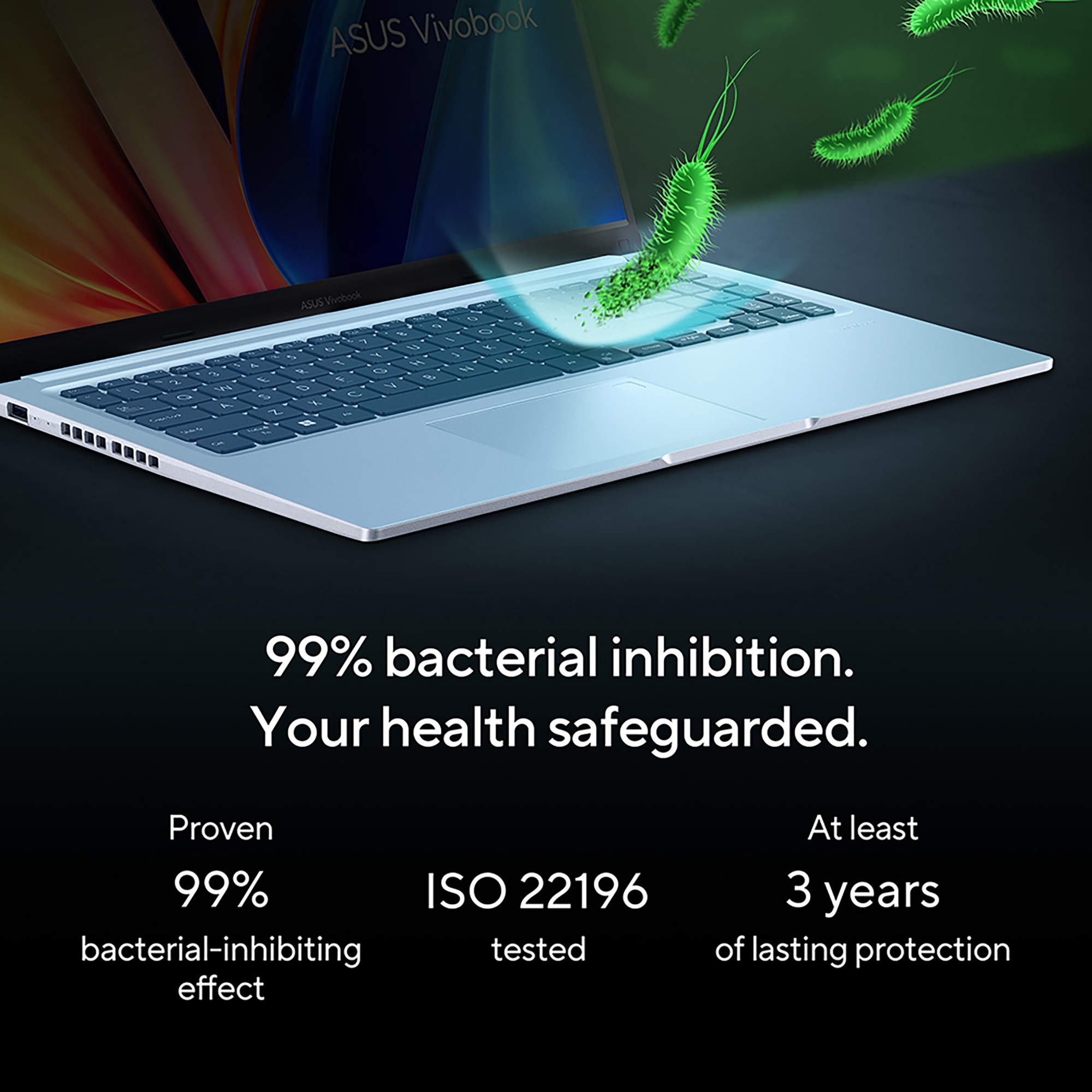 ASUS Antimicrobial Guard Plus is applied to frequently touched areas of your laptop to help keep it hygienic. This technology uses a denser treatment* that inhibits viruses and bacteria. And it is scientifically shown — using the ISO 21702* and 22196* standards — to inhibit virus and bacteria growth by more than 99% over a 24-hour period. Strains used for the tests include the SARS-CoV-2 (COVID-19), H3N2 (Influenza A) and the E. coli bacterium*.<br>* ISO 21702 tests for SARS-CoV-2 Variants (Omicron, BA.5), H3N2, H1N1 and ISO 22196 tests for Staphylococcus and E. coli.<br>* Treatments are approved by US FIFRA & EU BPR.