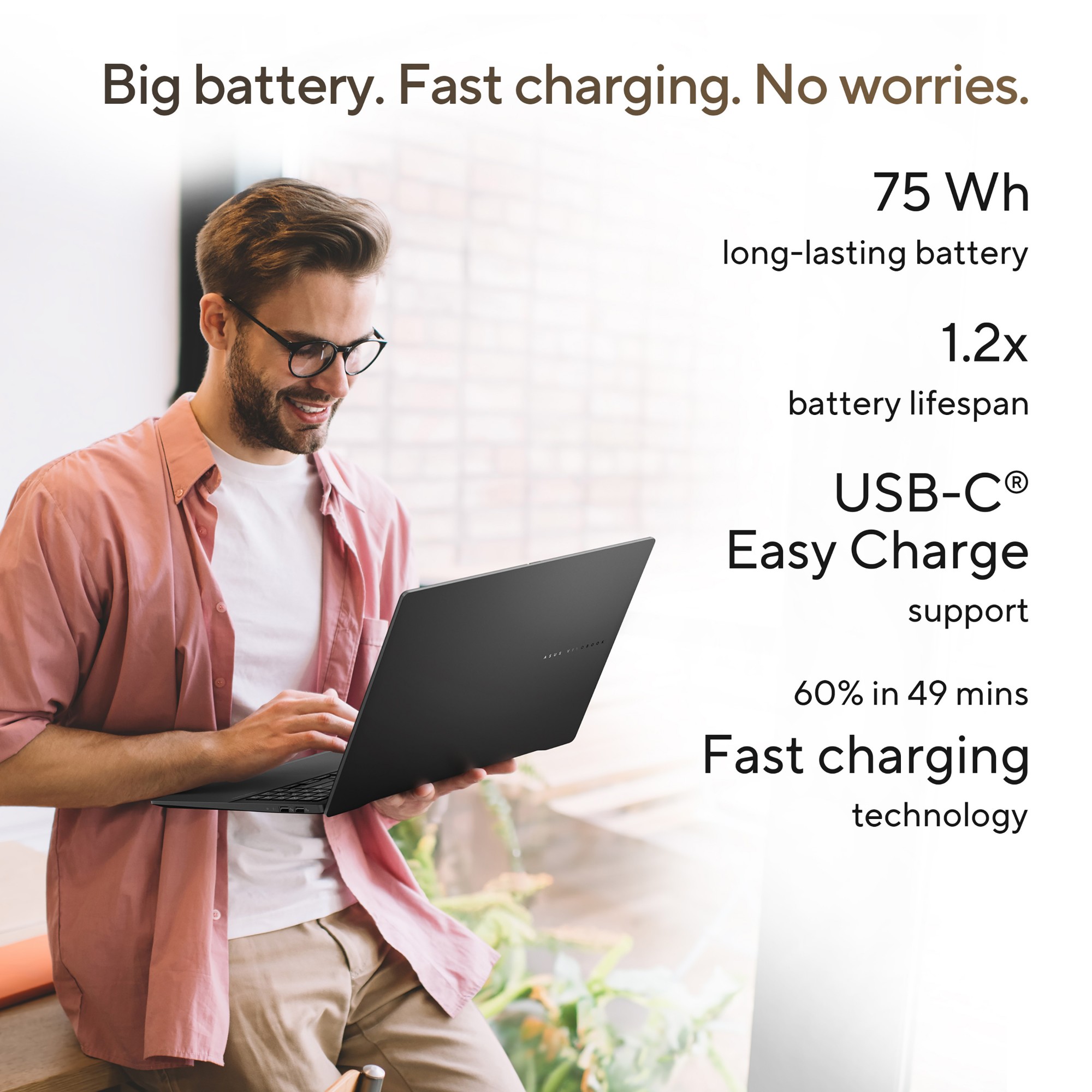Say goodbye to battery anxiety! ASUS Vivobook S 15 OLED boasts a generous 75 Wh high capacity battery7, providing up to 14+ hours3 long-lasting power for your entire day. What’s more, its fast-charging technology enables swift recharges so you can swiftly return to work or play without any delays.