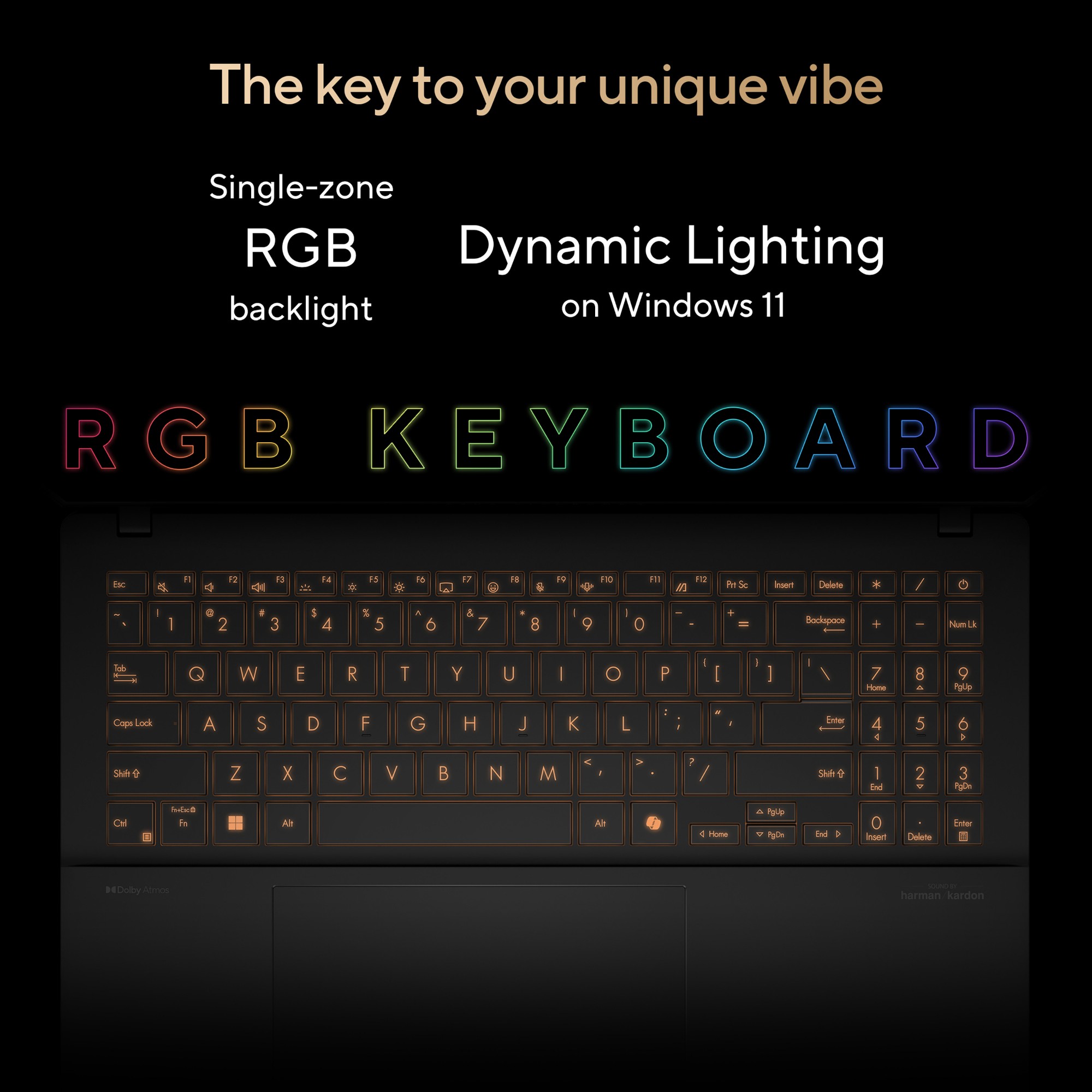 ASUS Vivobook S 15 OLED boasts a single-zone RGB backlit keyboard for customising the backlight with stunning lighting effects that match your personality and mood. With Windows Dynamic Lighting6, you can easily adjust colours, modes, and brightness levels right in Windows setting to make your keyboard stand out. <br>Also, ASUS Vivobook S 15 OLED has an enlarged touchpad for improved workflow and effortless navigation, ensuring precise and seamless interactions whether you’re working on projects, browsing the web, or relaxing.