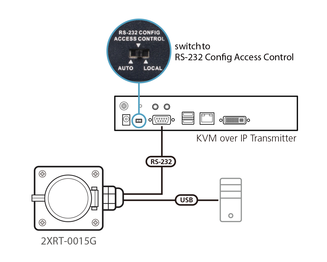 2. The slide switch on the rear side of the KVM over IP Transmitter needs to be switched to the RS-232 Config / Access Control position.