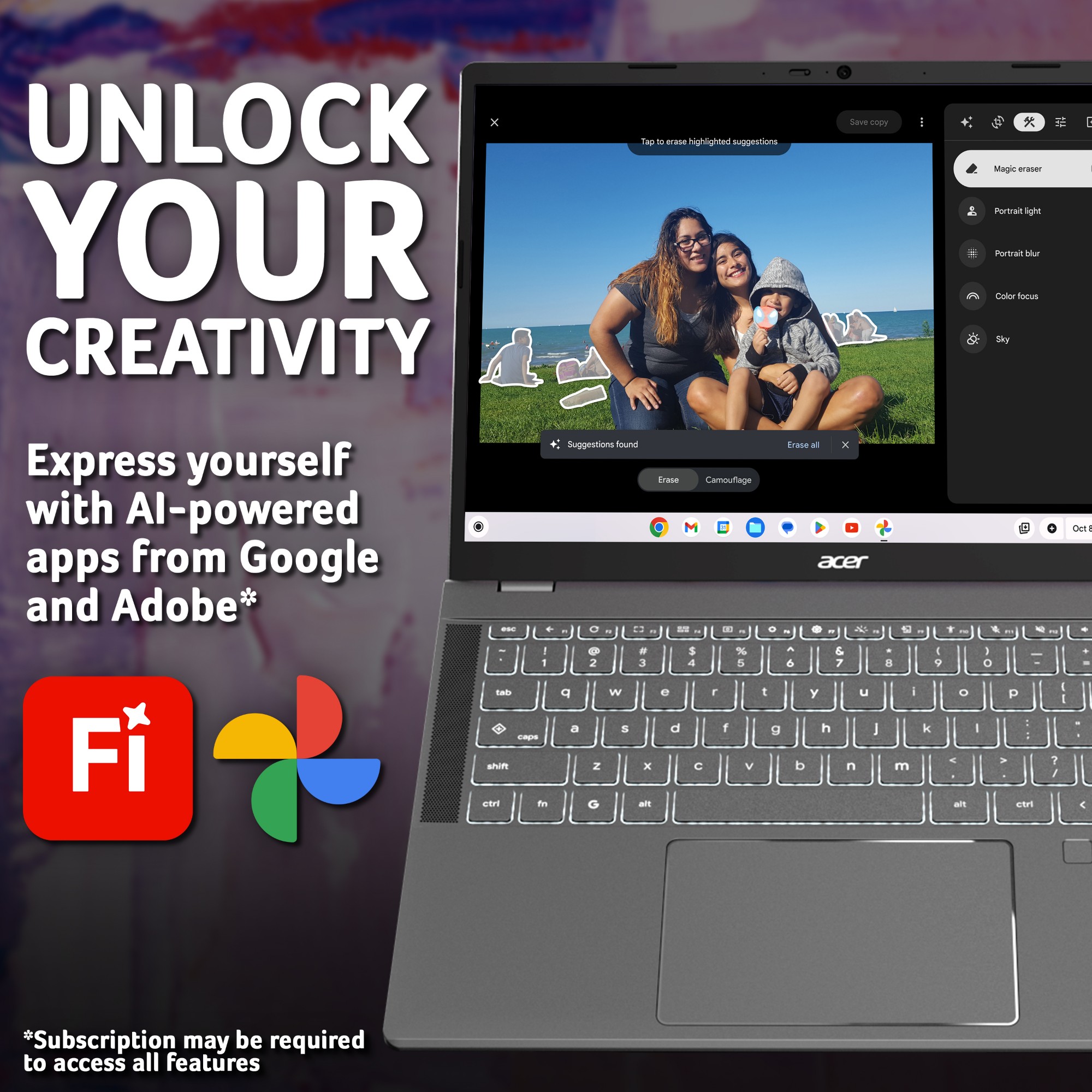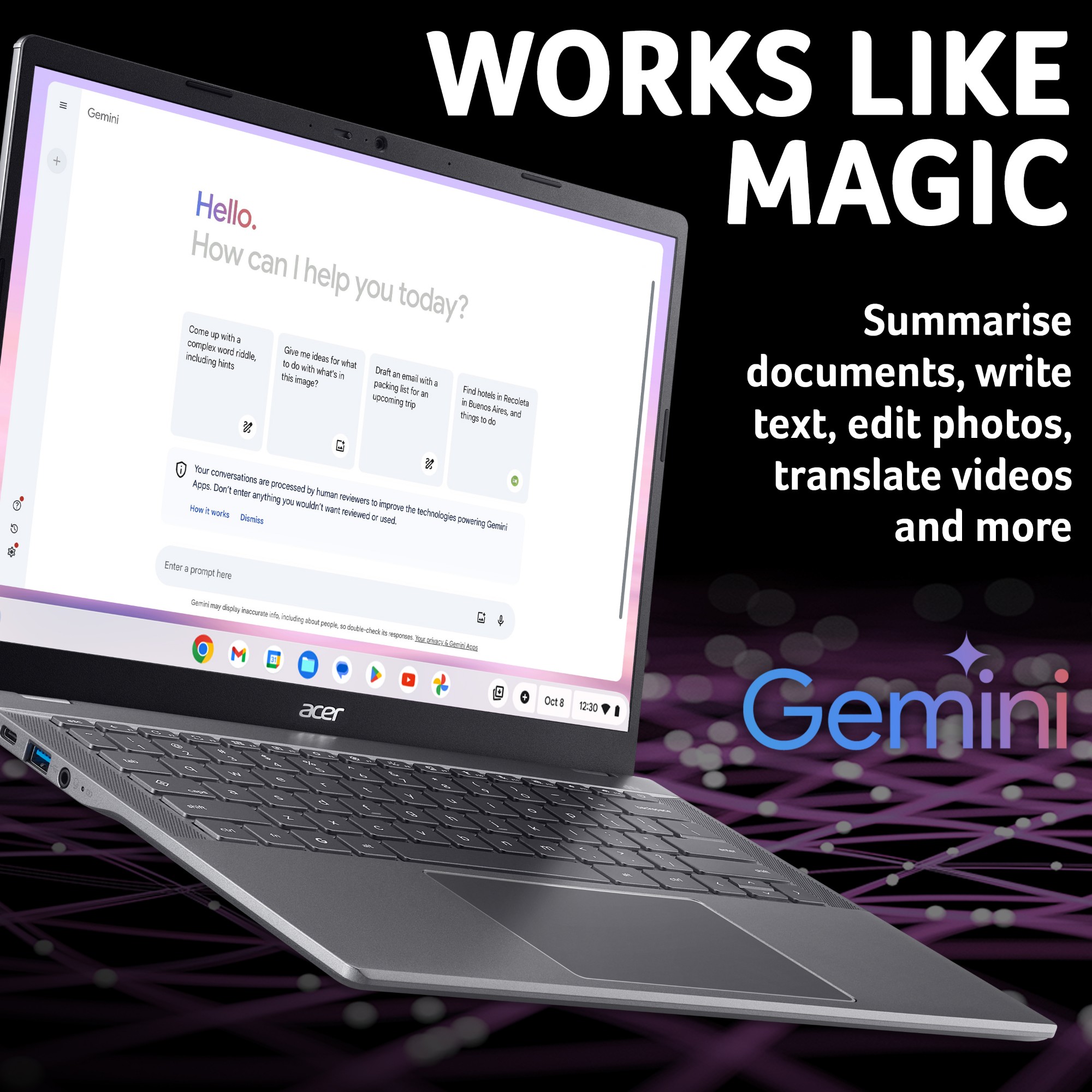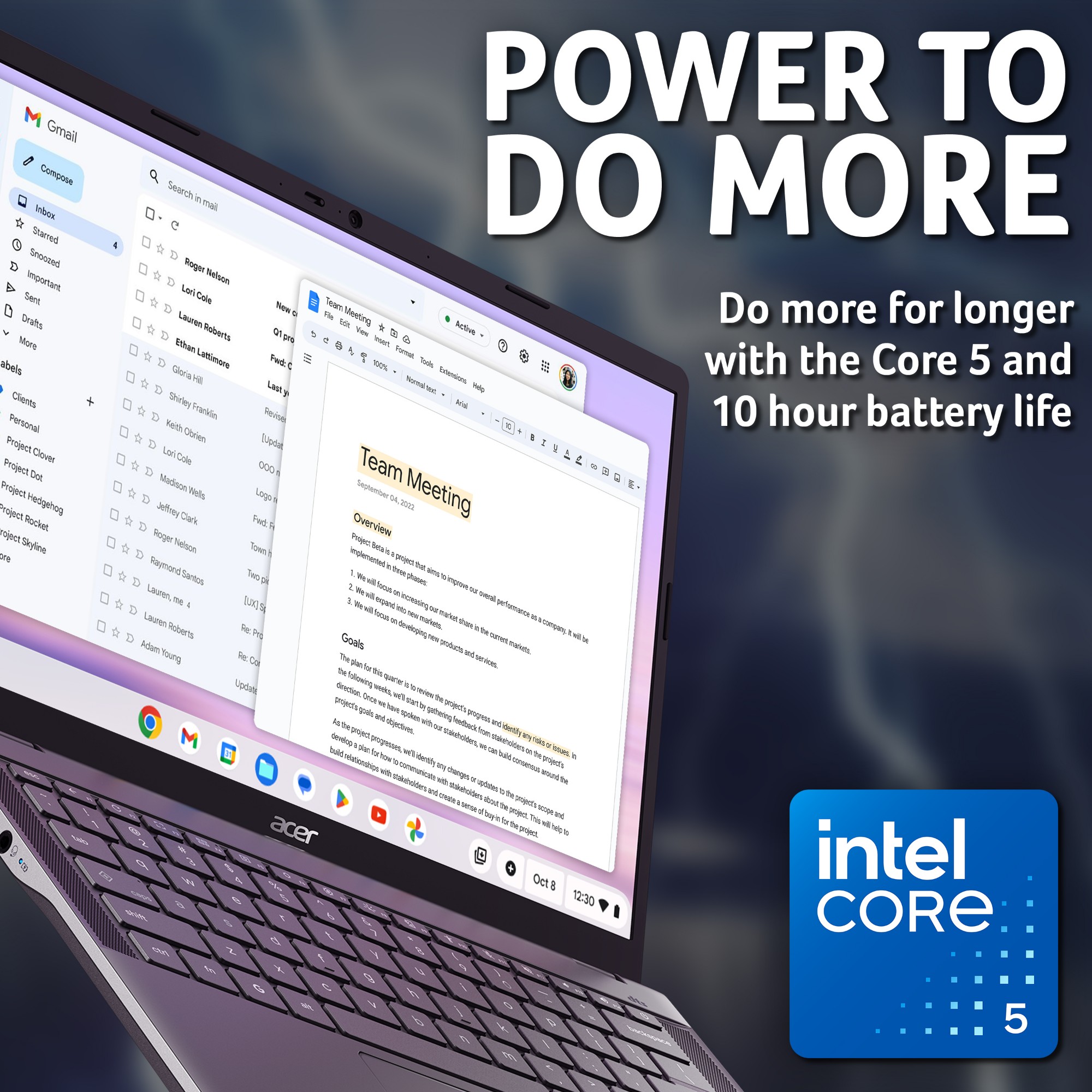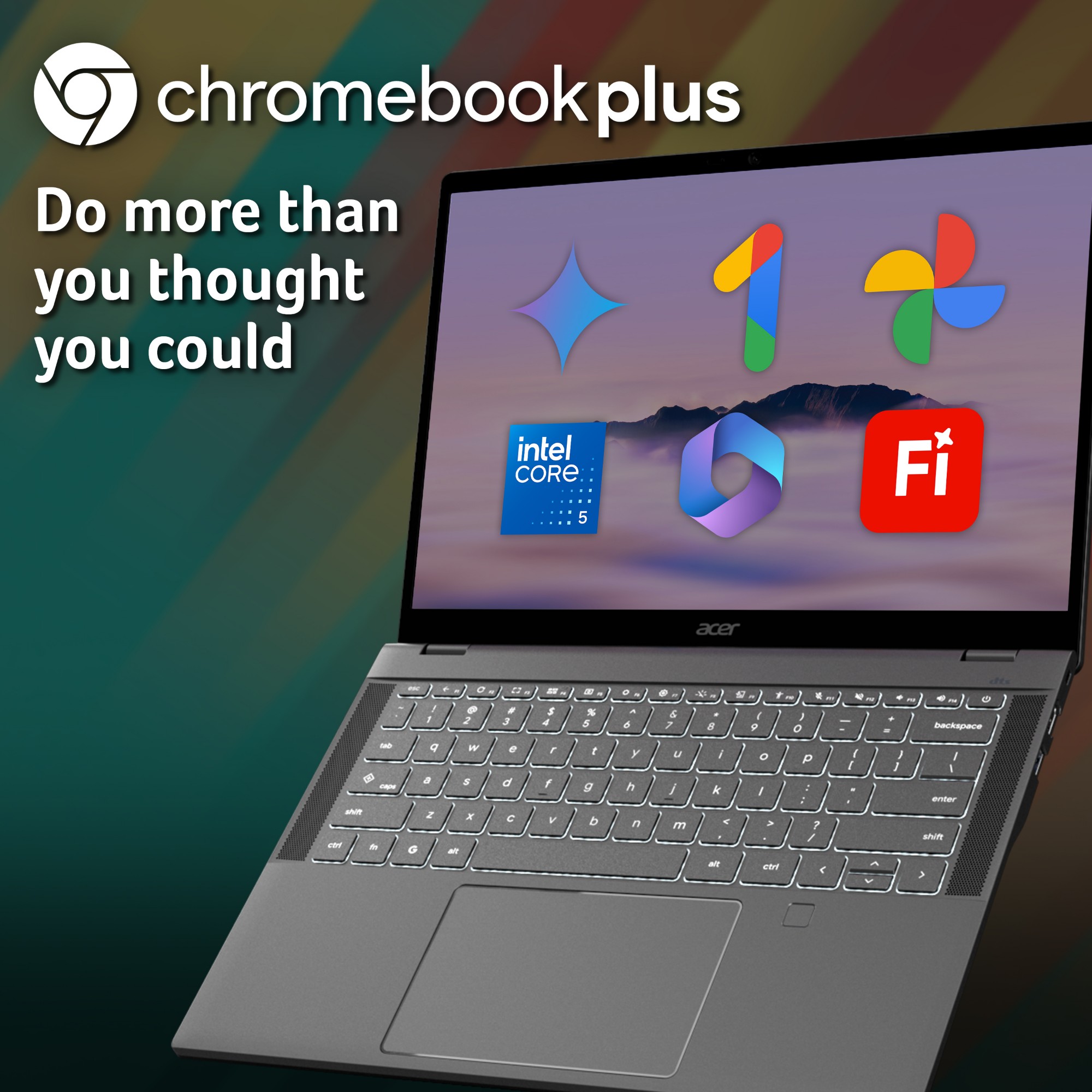 Boost productivity with the Acer Chromebook Plus 514. This Chromebook Plus laptop, with Google AI features built in, features an Intel Core i3-1315U processor and a 14” WUXGA display. Built tough and always connected, it's ready for anything.