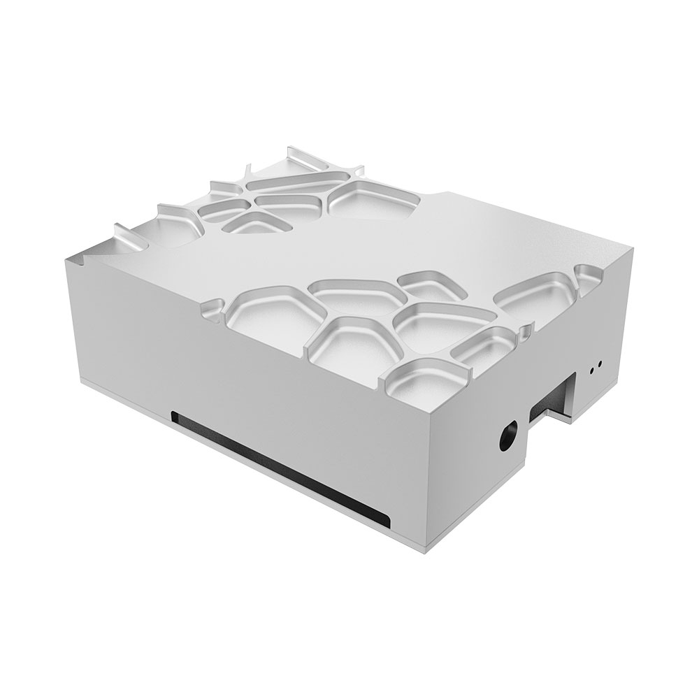 Silver case with striking gem-like design on top. Included thermal kit cools Raspberry Pi 4. Ideal centerpiece for an array of applications: smart home, media player, retro gaming, DAC and more.