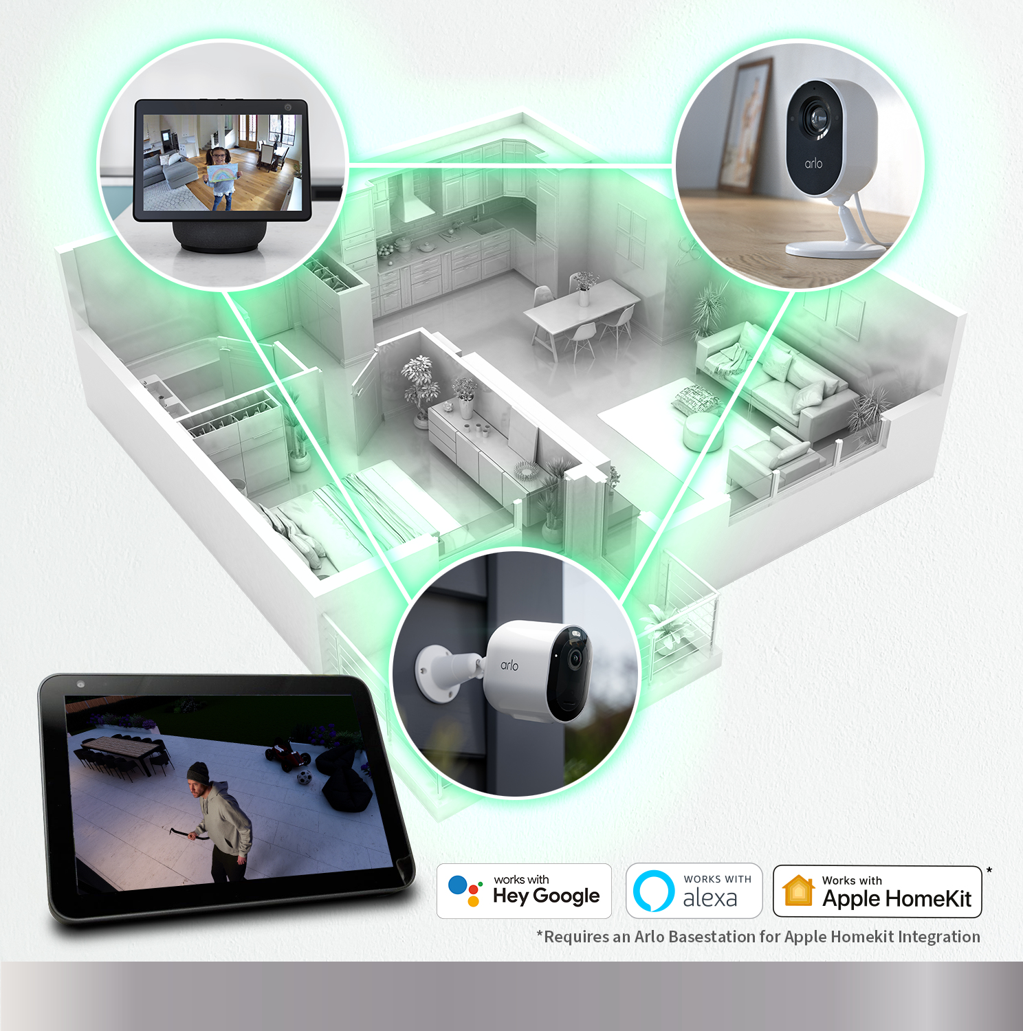 All Arlo cameras are compatible with most voice assistants including Alexa, Google Home and Apple HomeKit* for quick, hands-free control of your surveillance system.