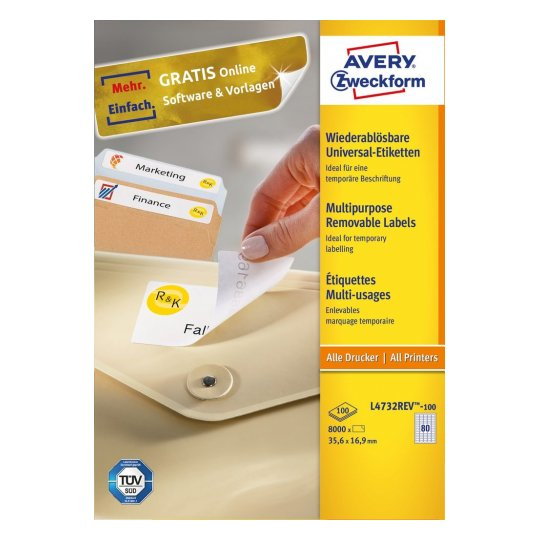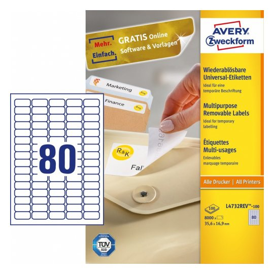 Avery L4732REV-100. Product colour: White, Label type: Self-adhesive printer label, Format: A4. Doesn't contain: PVC. Label width: 3.56 cm, Label height: 1.69 cm, Sheet width: 21 cm. Labels per pack: 8000 pc(s), Media sheets per package: 100 sheets, Labels per sheet: 80 pc(s)