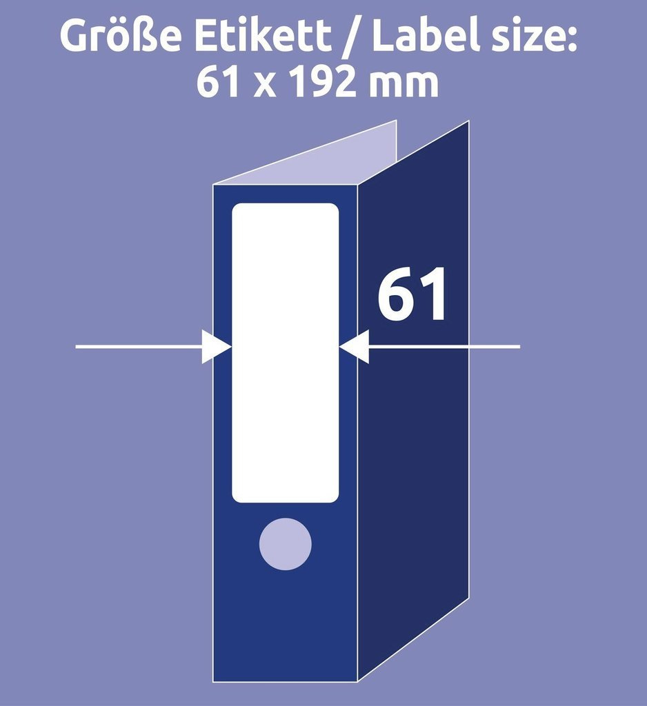 Avery L4761-25. Product colour: White, Shape: Rounded rectangle, Adhesive type: Permanent. Width: 61 mm, Height: 192 mm. Labels per pack: 120 pc(s). Doesn't contain: Chlorine