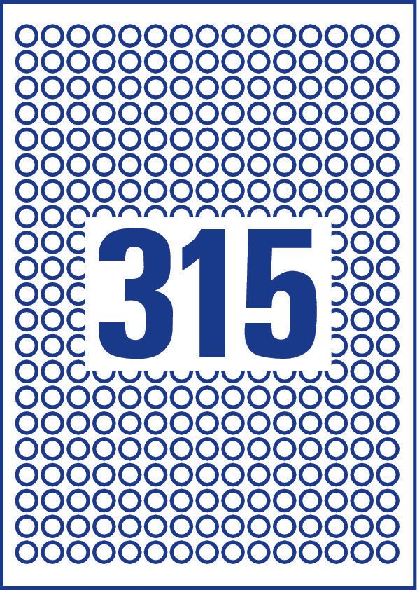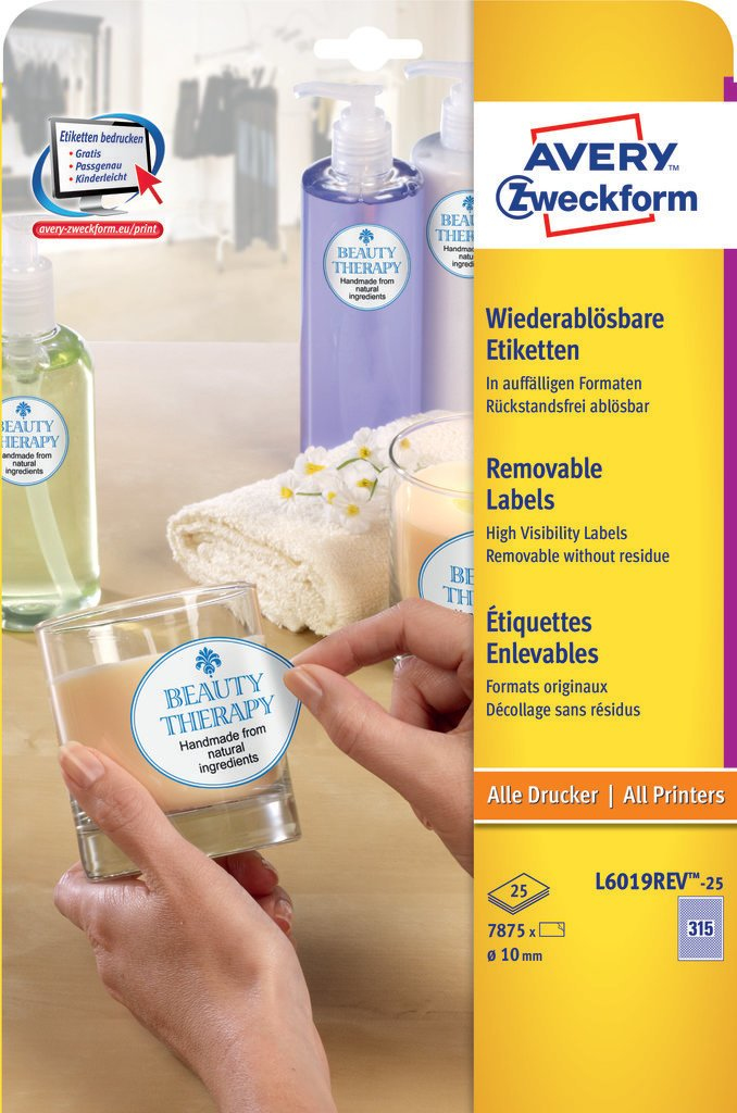 Avery L6019REV-25. Product colour: White, Shape: Circle, Adhesive type: Removable. Diameter: 1 cm. Labels per pack: 7875 pc(s). Doesn't contain: Chlorine