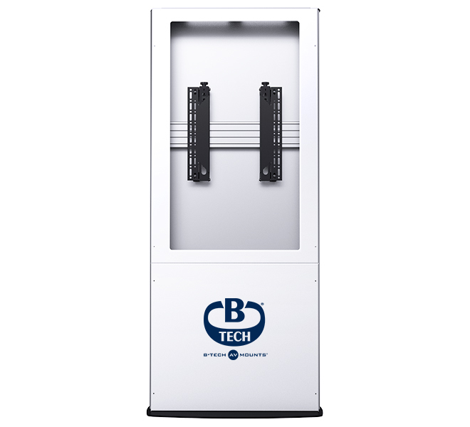 The BT7000 is a display kiosk designed to portrait mount a single digital signage screen. A rigid chassis is fixed to a heavy duty steel base which can be used freestanding or bolted to the floor and is finished stylishly with satin black or white outer covers. The internal mounting system is made up of parts from our System X range, allowing 8-point micro-adjustment to ensure the mounted screen sits perfectly level and flush with the front opening of the kiosk, which is laser cut to match your screen size.