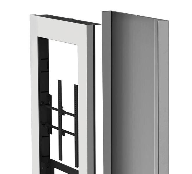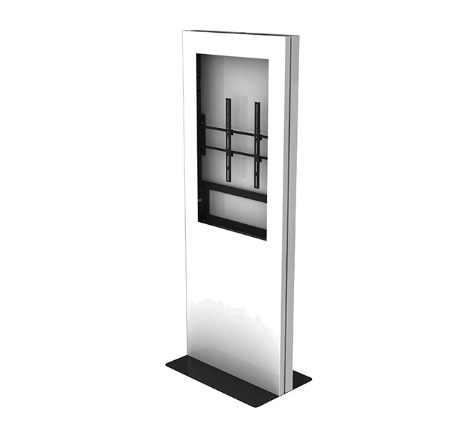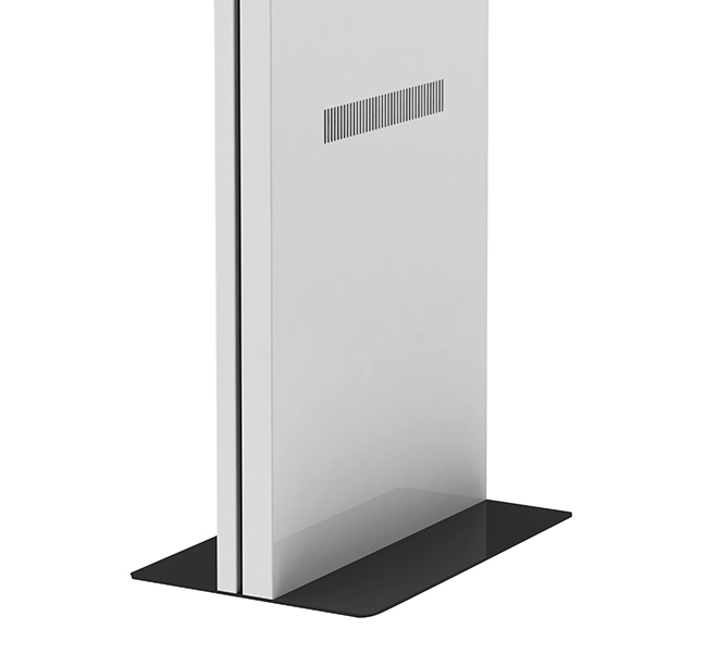 The BT7002 is an ultra-slim display kiosk designed to portrait mount a single digital signage screen. A rigid chassis is fixed to a heavy duty steel base which can be used freestanding or bolted to the floor and is finished stylishly with satin black or white outer covers. The internal mounting system is made to ensure the mounted screen sits perfectly level and flush with the front opening of the kiosk, which is laser cut to match your screen size.