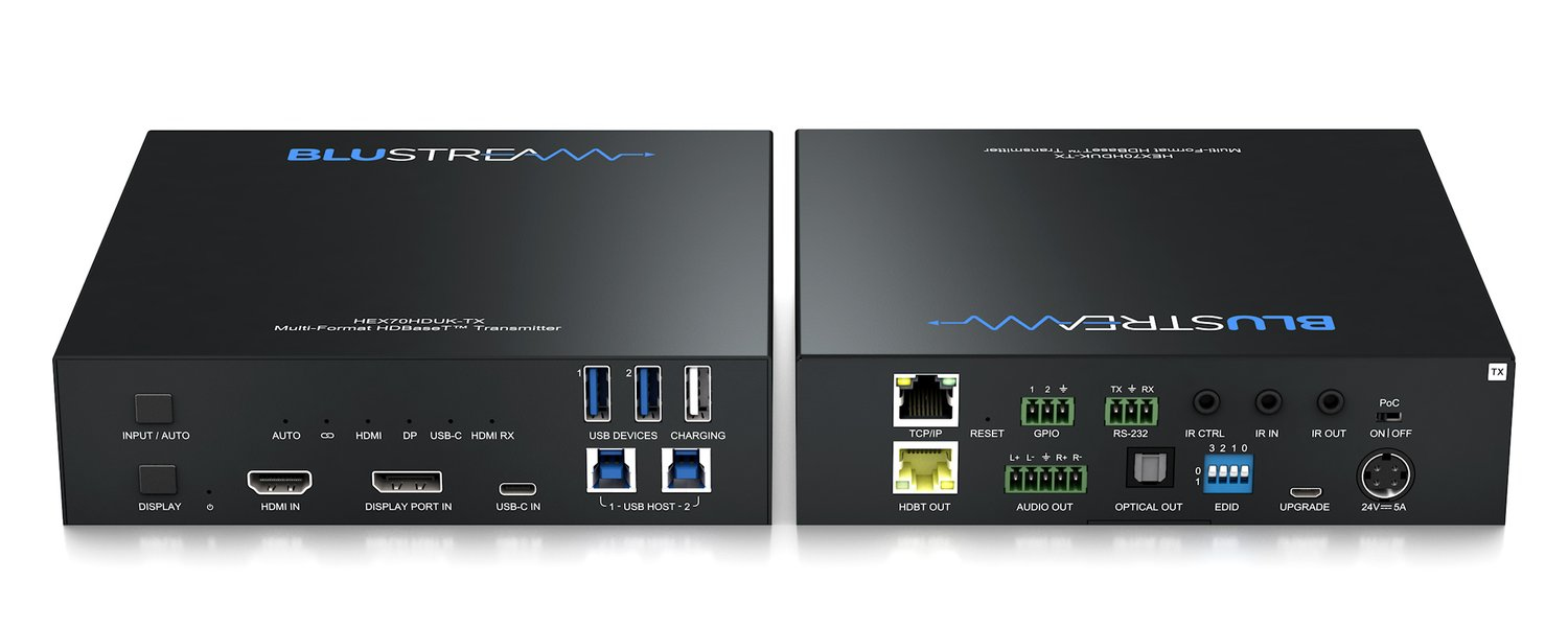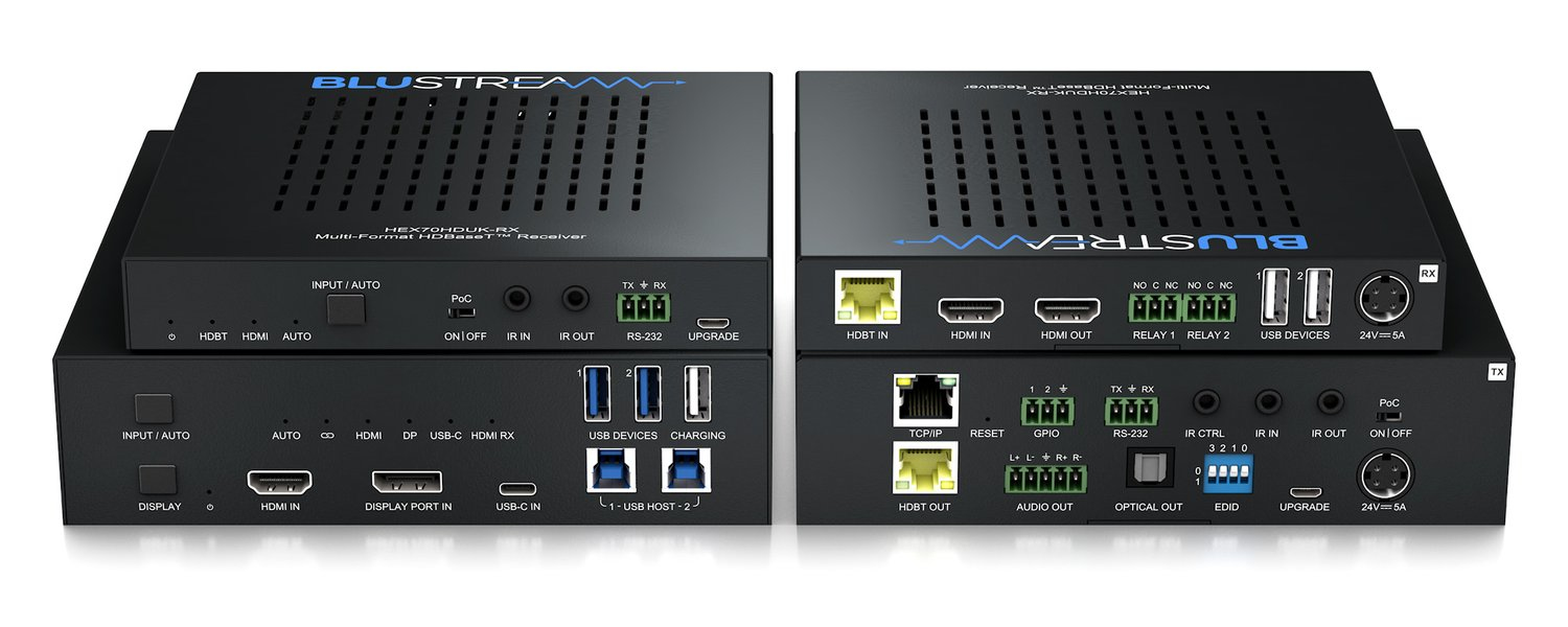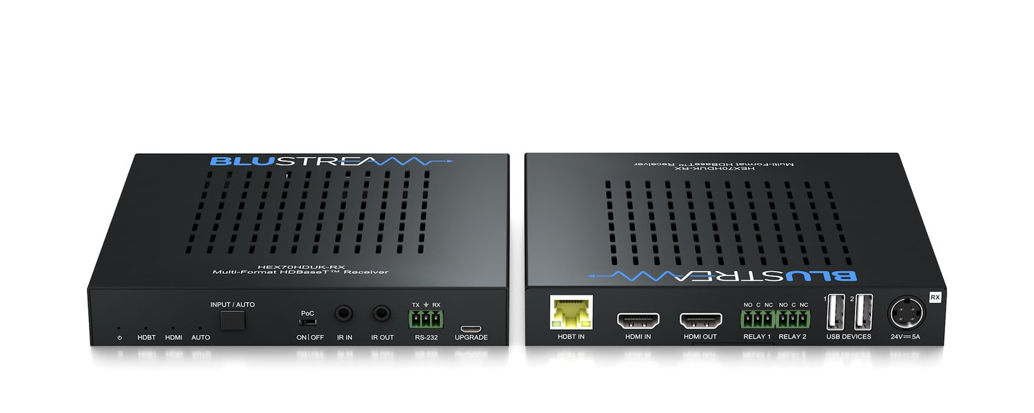 The HEX70HDUK-KIT provides enhanced features including USB 2.0 extension, local HDMI input on the HDBaseT™ Receiver for additional source input, web-GUI for control and configuration, auto display control, audio breakout and bi-directional IR pass-through.