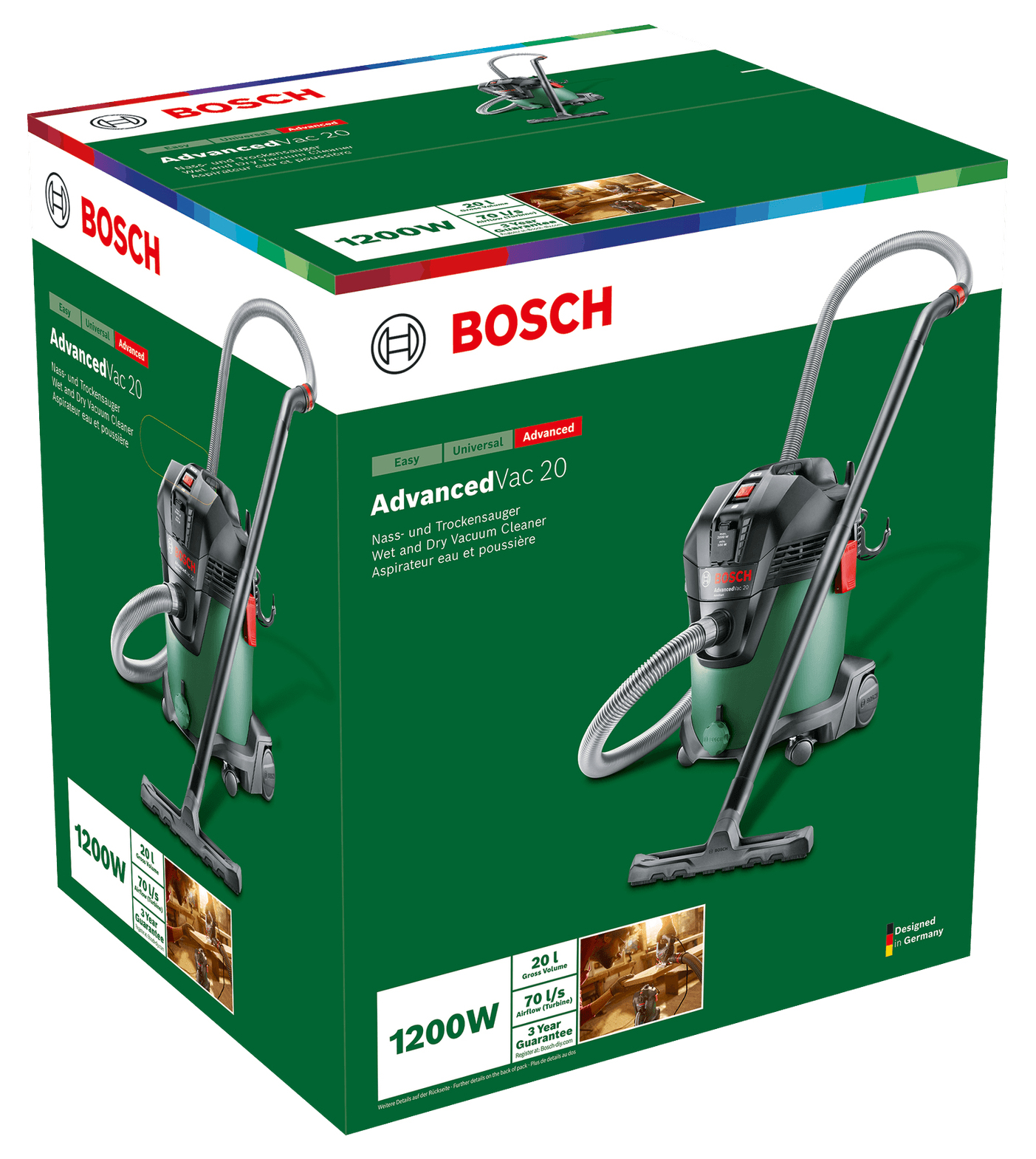 Bosch AdvancedVac 20. Capacity: 20 L, Ash container type: Bagless, Product colour: Black, Green. Cleaning type: Dry&wet, Vacuum: 260 mbar, Airflow: 70 l/s. Suction power: 300 AW, Power source: AC, Maximum input power: 1200 W. Width: 360 mm, Depth: 365 mm, Height: 499 mm