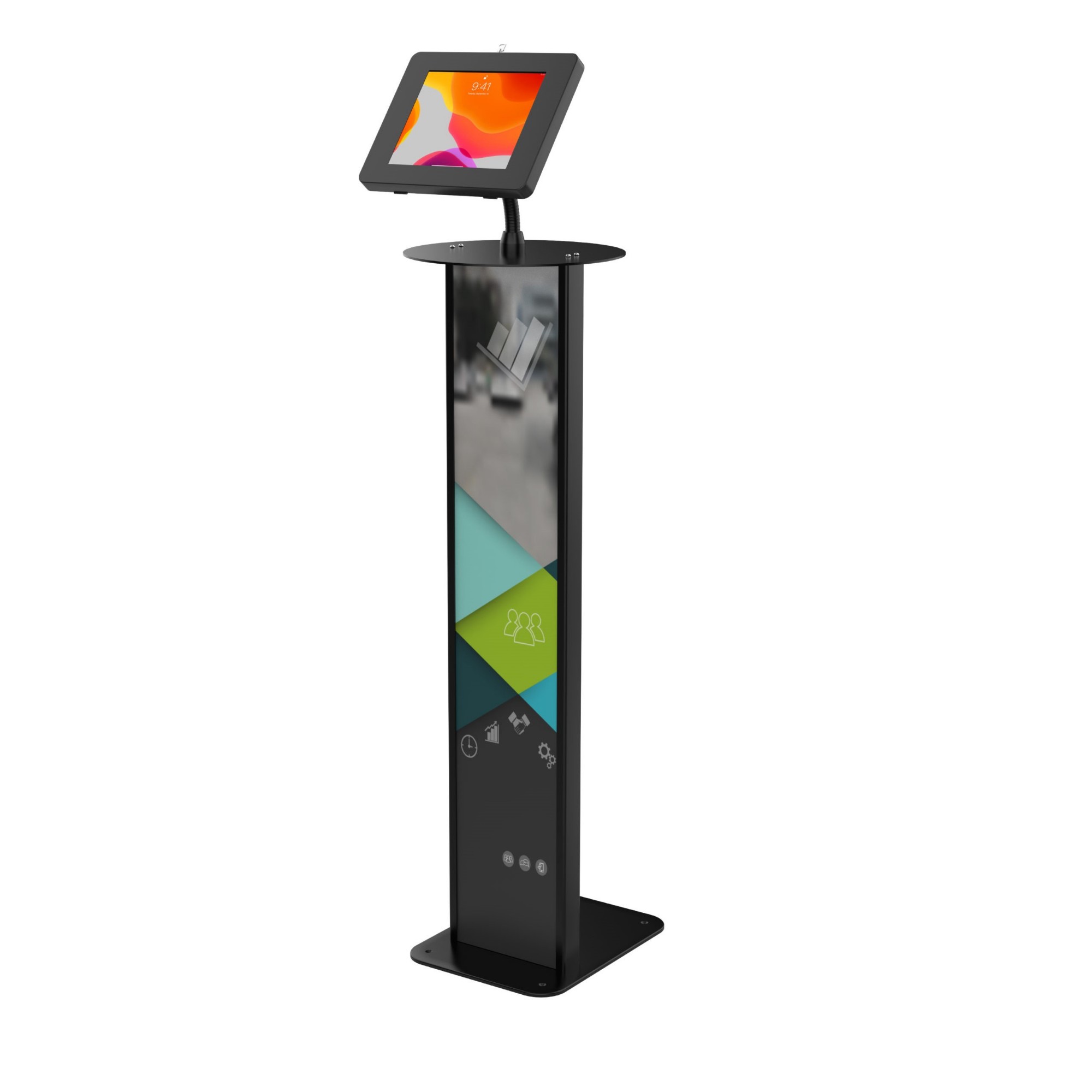 This workstation stand not only promotes your business, but also provides a secure place to manage all your business – for any industry! This stand has a slot in the front of the base that allows for customization of any color, logo, messaging, etc.! Insert your graphic with ease into the slots for easy installation. (We’ll provide specs to help you create the right size graphic.) You’ll find ample space behind the graphics panel to route charging cables. The sturdy black steel base and gooseneck mount provides a secure foundation for CTA Digital’s Premium Locking Security Enclosure. A powerful lock and key system keeps your tablet protected from theft. enclosure sits on a strong gooseneck base that allows nearly infinite adjustment angles in either portrait or landscape orientation, making this the perfect stand for retail, hospitality, trade shows, and more.