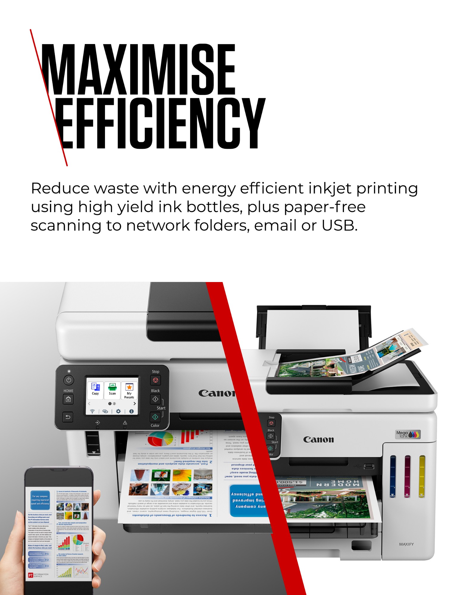 Reduce waste with energy efficient inkjet printing using high yield ink bottles, plus scanning to network folders, email or USB. A user-replaceable maintenance cartridge keeps downtime to a minimum.