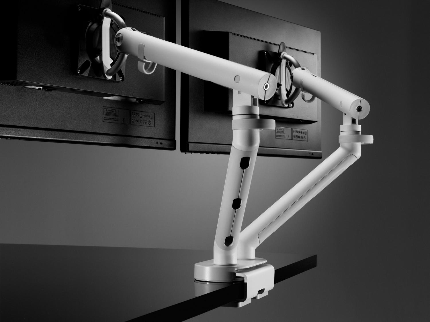 While in Stock - CBS Flo Dual Monitor Arm white trim; with wide clamp for desk edges of 18-90mm thickness
