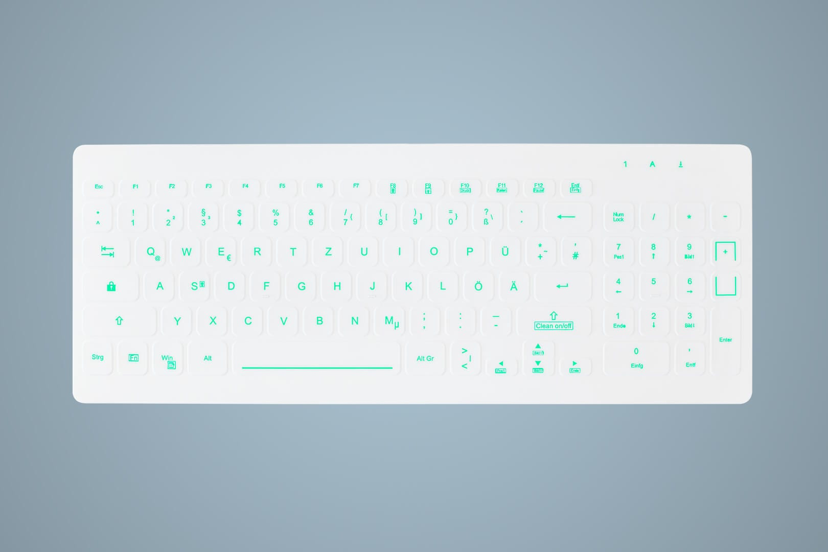 The „CleanFunction“ („FN“ + „Clean on/off“) enables deactivation of the key field during the cleaning process. Especially the ultra flat keys of the AK-CB7012 make it perfect for a thorough wipe disinfection.