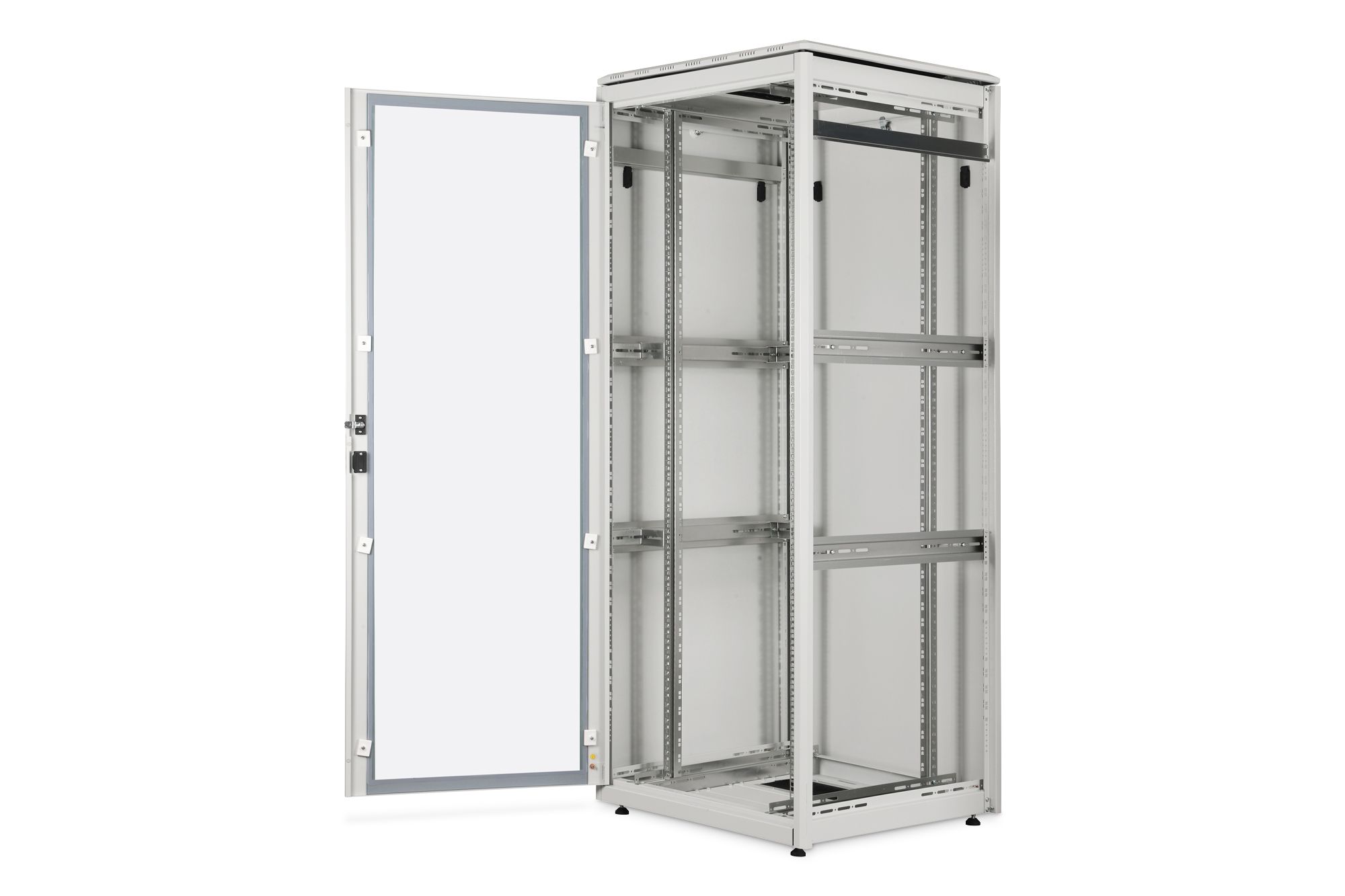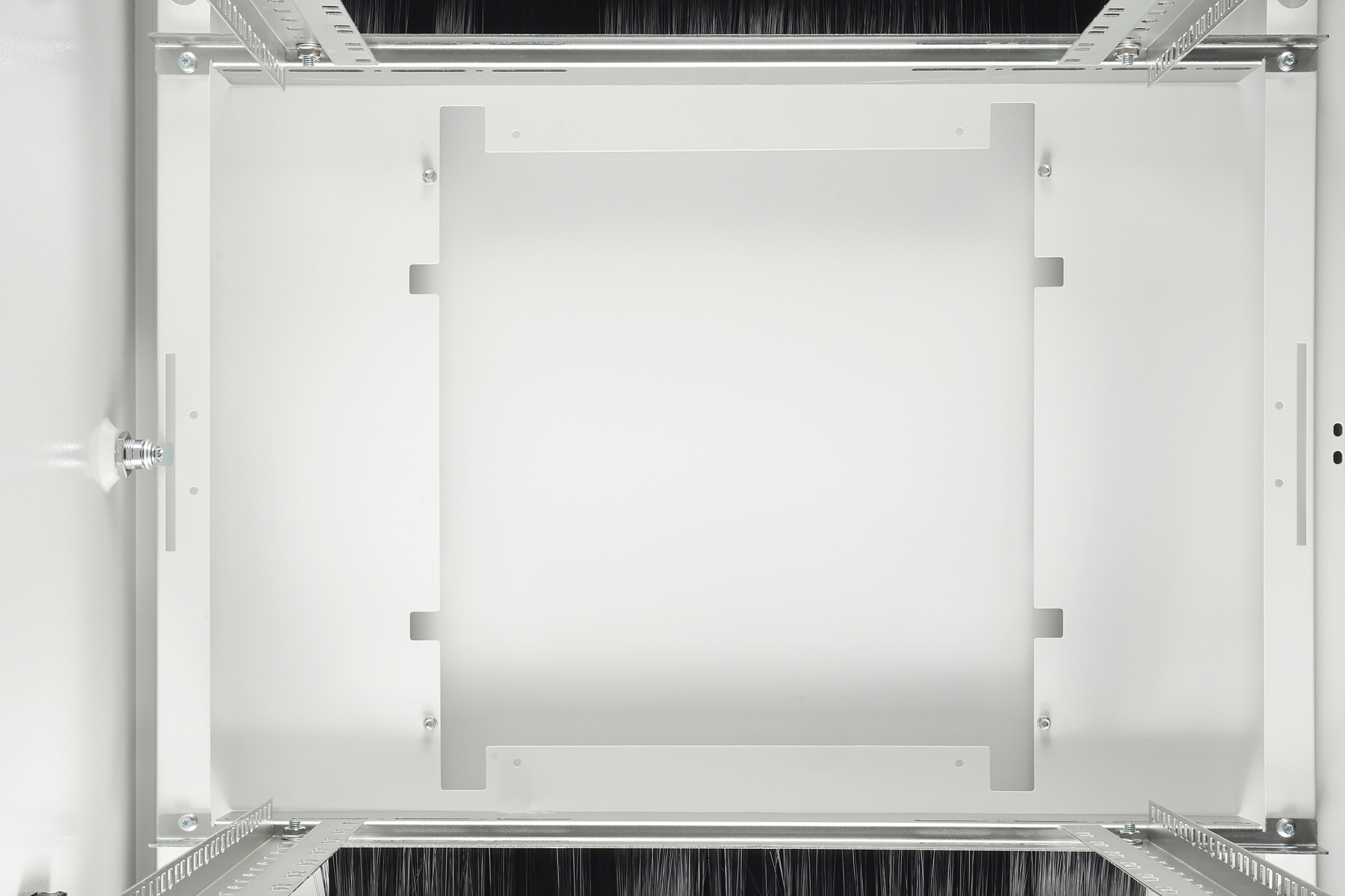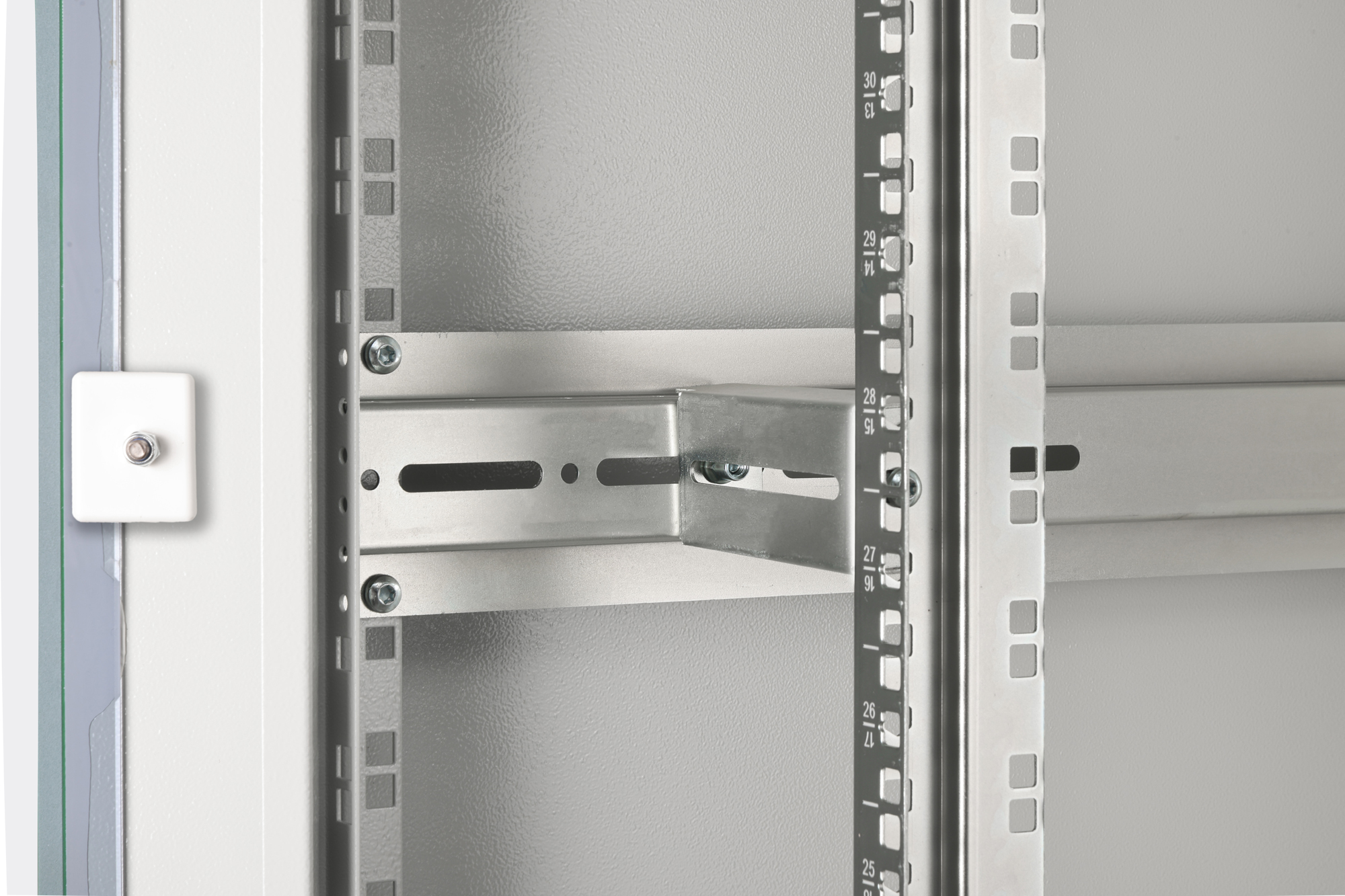 The network cabinets in the Unique Light series have been designed and produced for particularly convenient and flexible network cabling. Sophisticated optimizations offer market-compliant stability with maximum flexibility. A modular base chassis, which can be opened using screwed 483 mm (19") blind panels, offers sufficient space for cables of all kinds. In addition, there are side cable inlets with brushes at the top and bottom of the enclosure, as well as another at the rear of the base chassis. Two pairs of cranked and galvanized 483 mm (19") profile rails, labelled with height units that can be read in opposite directions, are installed inside. They are infinitely adjustable and are connected to additional depth struts in the cabinet. Each enclosure is a robust steel construction made from sheet steel up to 1.5 mm thick. The coloring takes the form of electrostatic powder coating in the standard colors grey (RAL 7035) and black (RAL 9005). Modular lockable and removable side panels and doors improve accessibility. Door hinges can be changed. Furthermore, the cabinets can be completely dismantled if required thanks to the demountable design.