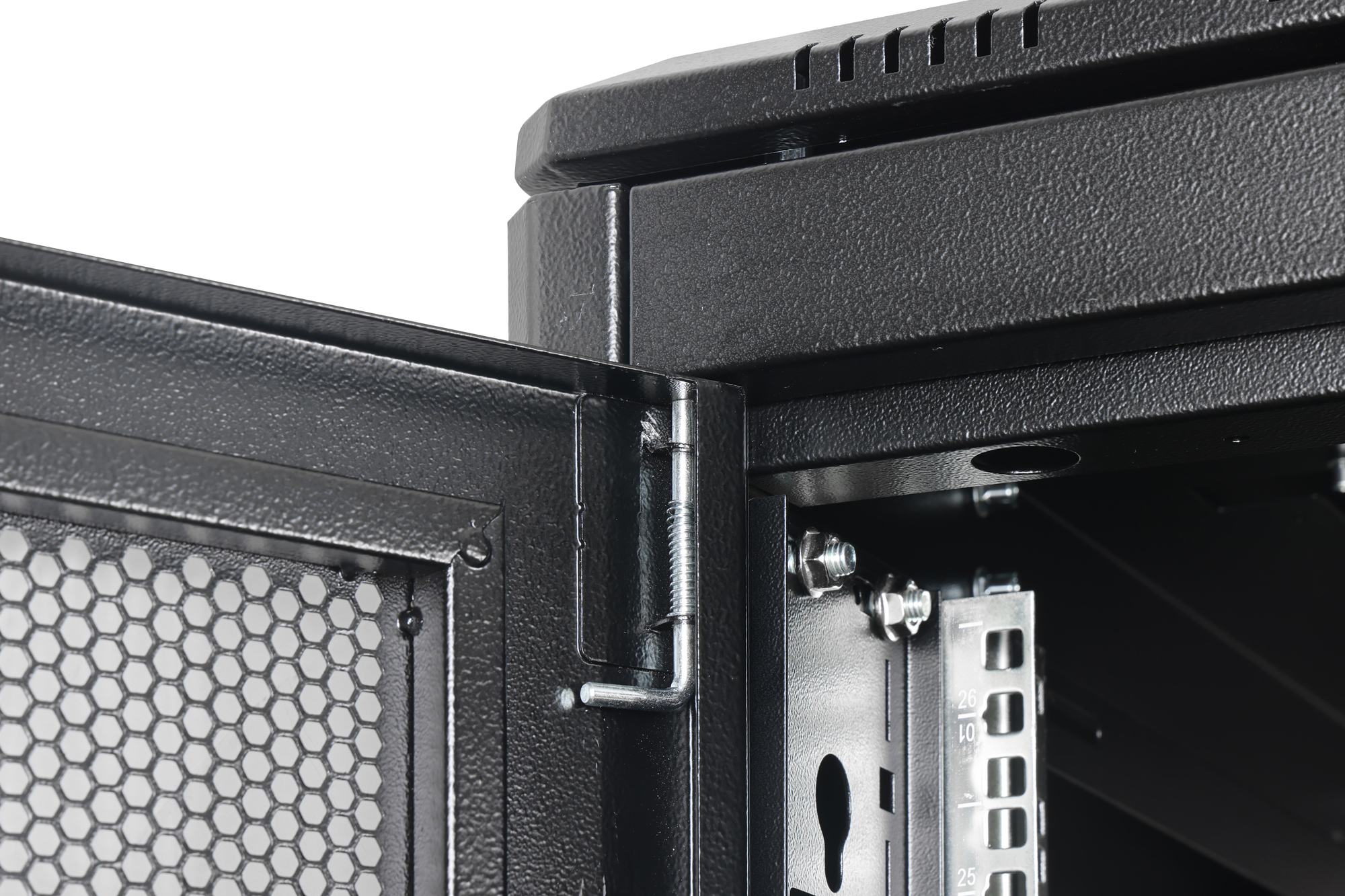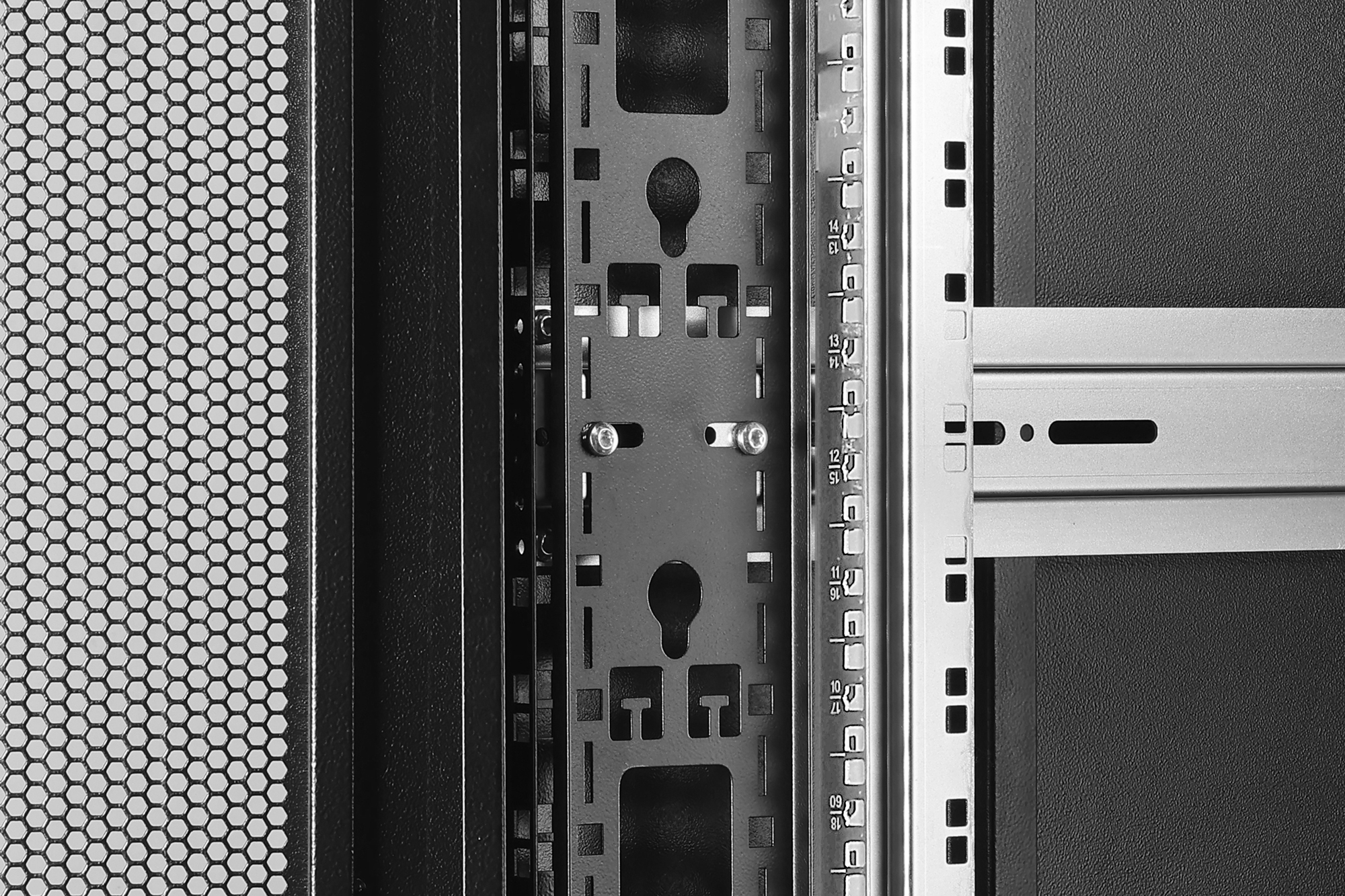 The server cabinets in the Unique Server-N series have been designed and produced for particularly convenient and flexible network cabling. Sophisticated optimizations offer market-compliant stability with maximum flexibility. A modular base chassis, which can be opened using screwed 483 mm (19") blind panels, offers sufficient space for cables of all kinds. There are also cable inlets with brushes at the rear of the floor chassis. Generous vertical cable ducts with cable routing aids and covers, installed in the front (from 800 mm enclosure width), as well as integrated holders for socket strips in the rear enclosure area, perfectly round off the versatile features of the server enclosure. Perforated steel doors, both at the front and rear, ensure improved air circulation and therefore optimum passive cooling. Two pairs of cranked and galvanized 483 mm (19") profile rails, labelled with height units that can be read in opposite directions, are installed inside. They are infinitely adjustable and are connected to additional depth struts in the cabinet. Each enclosure is a robust steel construction made from sheet steel up to 1.5 mm thick. The coloring takes the form of electrostatic powder coating in the standard colors grey (RAL 7035) and black (RAL 9005). Modular lockable and removable side panels and doors improve accessibility. Door hinges can be changed. Furthermore, the cabinets can be completely dismantled if required thanks to the demountable design.