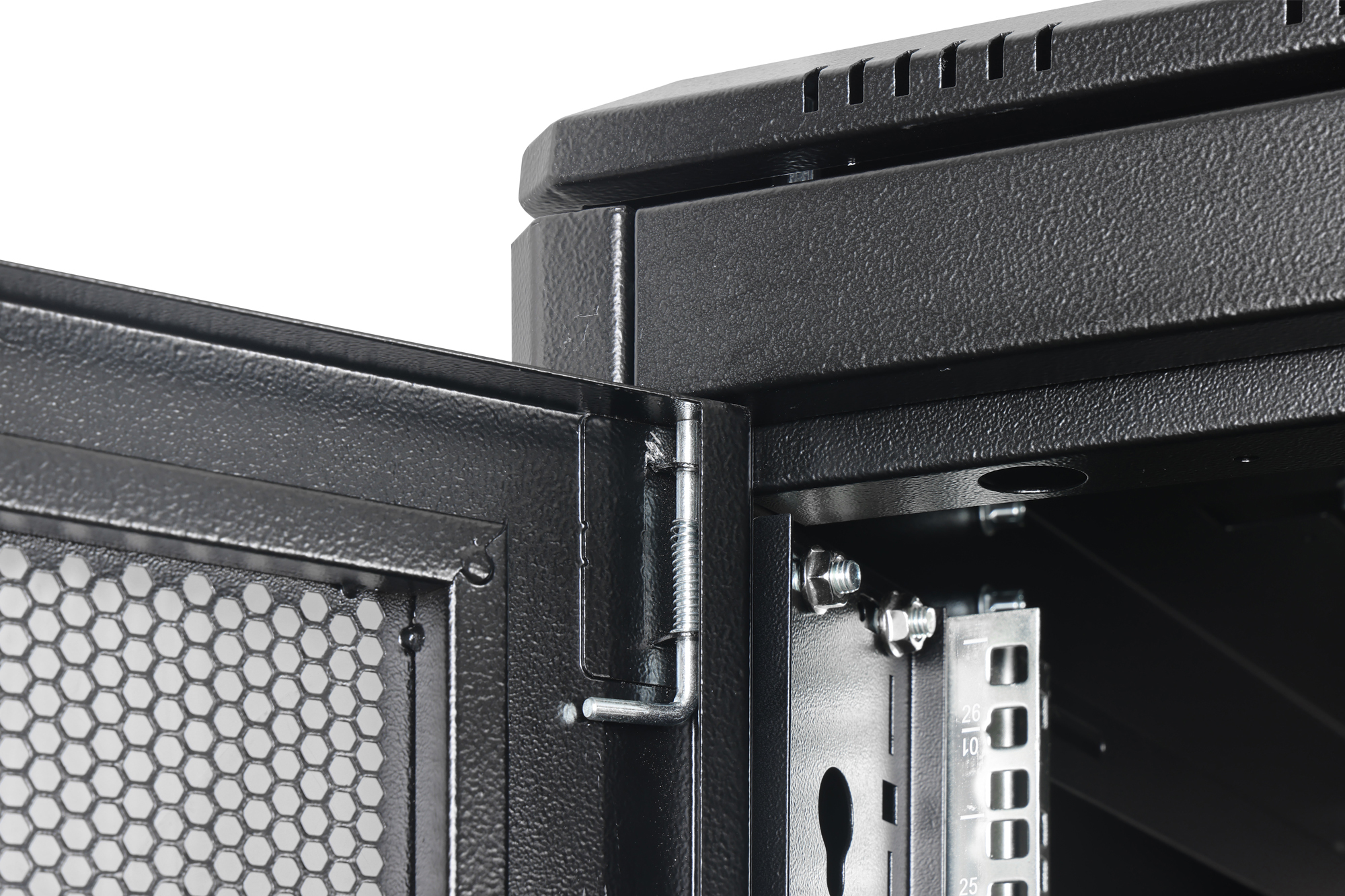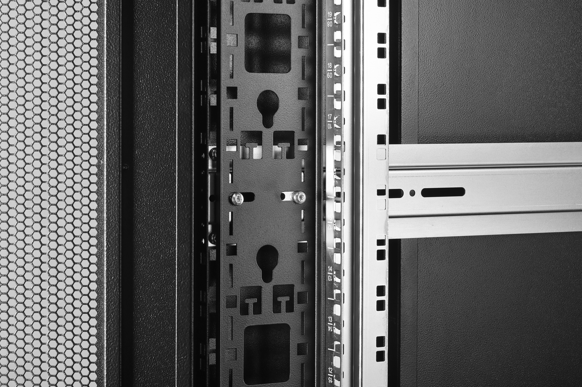 The server cabinets in the Unique Server-N series have been designed and produced for particularly convenient and flexible network cabling. Sophisticated optimizations offer market-compliant stability with maximum flexibility. A modular base chassis, which can be opened using screwed 483 mm (19") blind panels, offers sufficient space for cables of all kinds. There are also cable inlets with brushes at the rear of the floor chassis. Generous vertical cable ducts with cable routing aids and covers, installed in the front (from 800 mm enclosure width), as well as integrated holders for socket strips in the rear enclosure area, perfectly round off the versatile features of the server enclosure. Perforated steel doors, both at the front and rear, ensure improved air circulation and therefore optimum passive cooling. Two pairs of cranked and galvanized 483 mm (19") profile rails, labelled with height units that can be read in opposite directions, are installed inside. They are infinitely adjustable and are connected to additional depth struts in the cabinet. Each enclosure is a robust steel construction made from sheet steel up to 1.5 mm thick. The coloring takes the form of electrostatic powder coating in the standard colors grey (RAL 7035) and black (RAL 9005). Modular lockable and removable side panels and doors improve accessibility. Door hinges can be changed. Furthermore, the cabinets can be completely dismantled if required thanks to the demountable design.