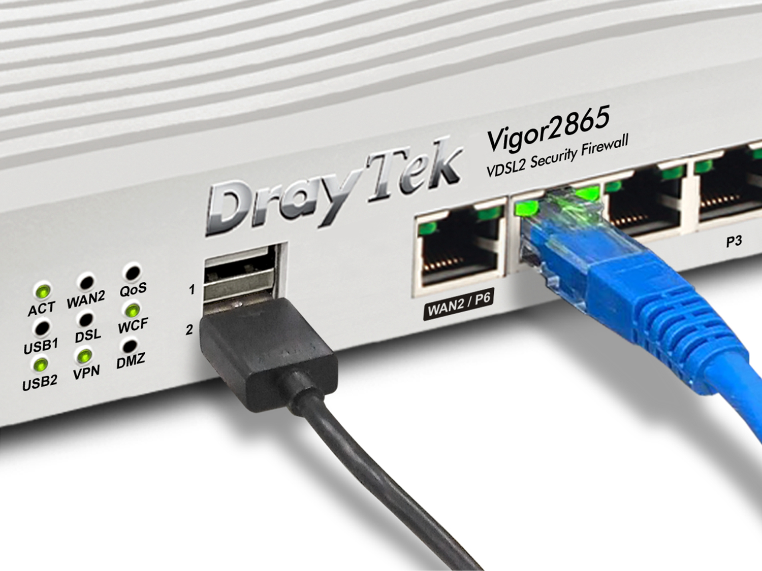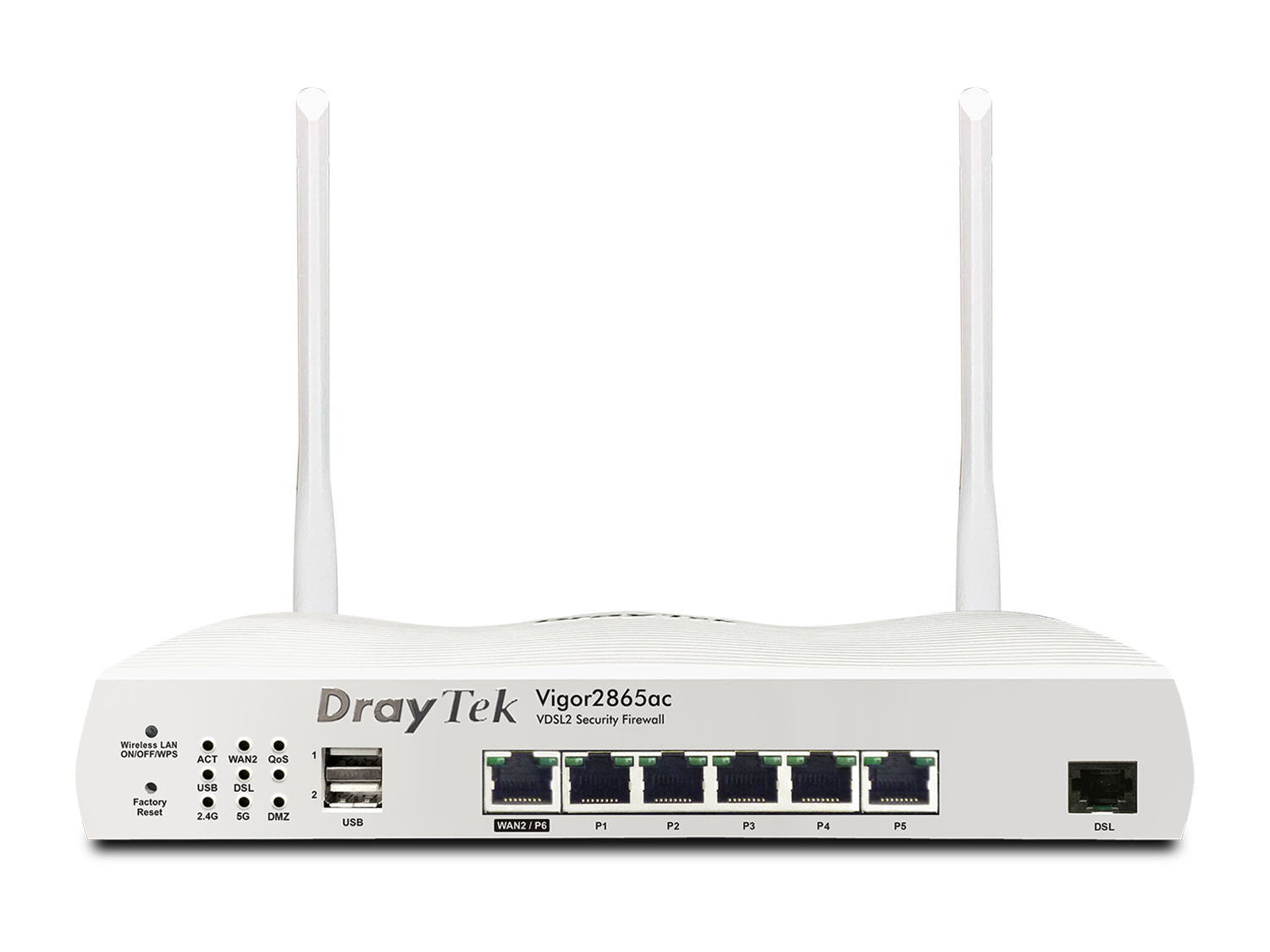 Vigor2865 Series is a VDSL2 35b/ADSL2+ Security Firewall router integrating a DSL modem which is compatible with variants of ADSL and VDSL, including profile 35b supervectoring. There is also a Gigabit Ethernet WAN port for broadband connections to share the traffic load or serve as a failover connection. 3G/4G/LTE USB modem can also be attached to the USB ports of the router. The 2865 LTE series includes models with built-in 802.11ac Wave 2 wireless standard and VoIP gateway.