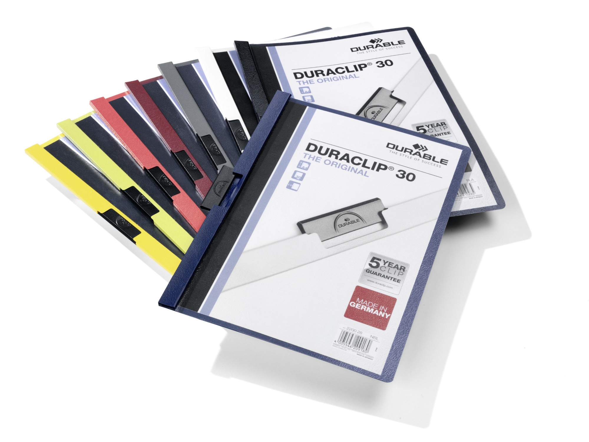 The DURACLIP® 30 folder has a capacity of 30 A4 sheets, a transparent front cover and coloured back and spine.