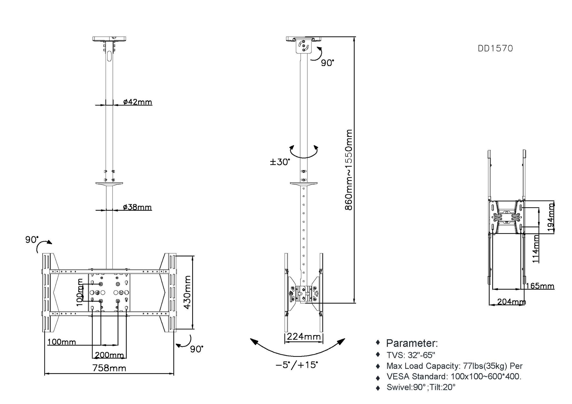 32"-65" Ceiling Mount Dual Screen TV Bracket, Black