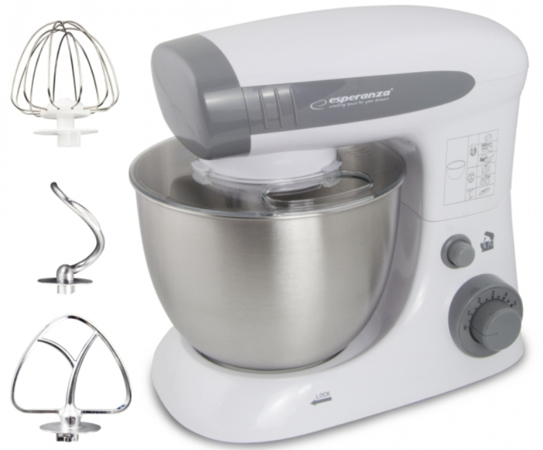 Esperanza universal food processor COOKING ASSISTANT is equipped with powerful and durable engine, so that you can handle even the most difficult kitchen challenges. The professional beater can allow you whip up fluffy cream for desserts, and egg white foam for biscuits, meringue cakes, waffles and other kind of cakes. If you want to surprise your guests with home-made pasta, pizza or bread straight from the oven, the special hook and whisk will help you to prepare in few moments. The taste of a home-made cake, baked by grandma or mother, remains in the memories of each of us for a long time. To let your loved ones enjoy it, this professional stand mixer can serve the entire range of homemade baked food.