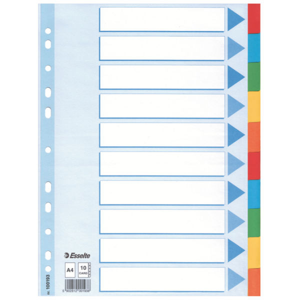 Divider in bright colour combinations. Made from recycled cardboard. Front sheet has large space for section description.