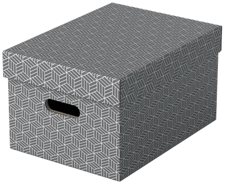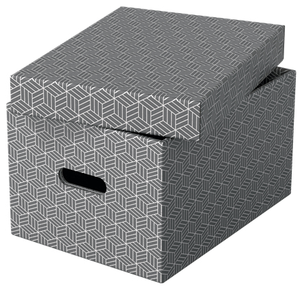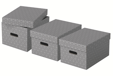 Stylish and modern cardboard storage boxes with removable lid ideal for creating instant storage at home. Set of three boxes in the same size to use alone, store on shelves or in cube storage units to keep items such as paperwork, books and toys organised and easy to find. Each box features 2 integrated carry handles so it can be easily carried from room to room when required. Made from strong, 100% recycled and 100% recyclable corrugated cardboard which is FSC certified. The wipe clean surface is finished with a dual colour, geometric design to add style to your storage. Comes supplied flat packed and is quick and easy to assemble. The sides fold back on themselves during assembly to provide double the strength, ensuring the boxes stay strong and protect the contents.