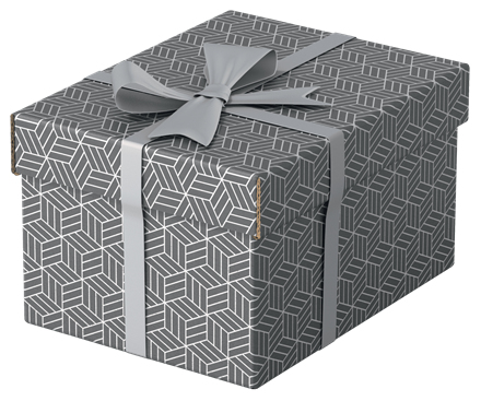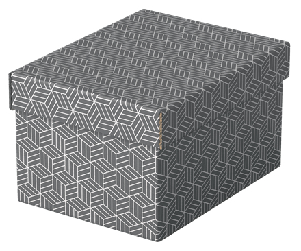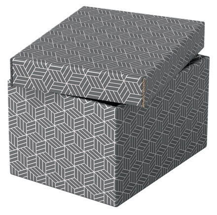 Stylish and modern cardboard storage boxes with removable lid ideal for packaging gifts or creating instant storage at home. Set of three boxes in the same size to use alone, store on shelves or in cube storage units to keep smaller items such as photographs and personal documents organised and easy to find. Add some ribbon and use to package a gift! Once opened, it can be reused by the recipient for home storage, providing 2 gifts in one. Made from strong, 100% recycled and 100% recyclable corrugated cardboard which is FSC certified. The wipe clean surface is finished with a dual colour, geometric design to add style to your storage. Comes supplied flat packed and is quick and easy to assemble. The sides fold back on themselves during assembly to provide double the strength, ensuring the boxes stay strong and protect the contents.
