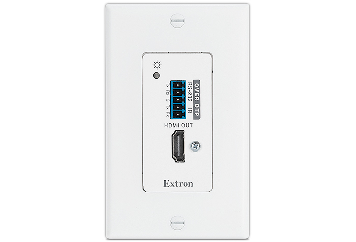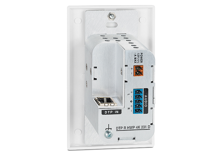 The Extron DTP R HWP 4K 231 D is a single-gang Decora®-style receiver that works with Extron DTP®-enabled products to send HDMI, audio, and bidirectional RS‑232 and IR signals up to 230 feet (70 meters) over a shielded CATx cable. The one-gang form factor provides maximum space efficiency in wall mount, floor box, and furniture mount applications. The DTP R HWP 4K 231 D supports video signals at resolutions up to 4K. It also accepts analog stereo audio signals from a DTP-enabled product over the same shielded twisted pair cable. The wall-mountable design and remote power capability of the DTP R HWP 4K 231 D provide the convenience of placing output connections precisely where they are needed.
