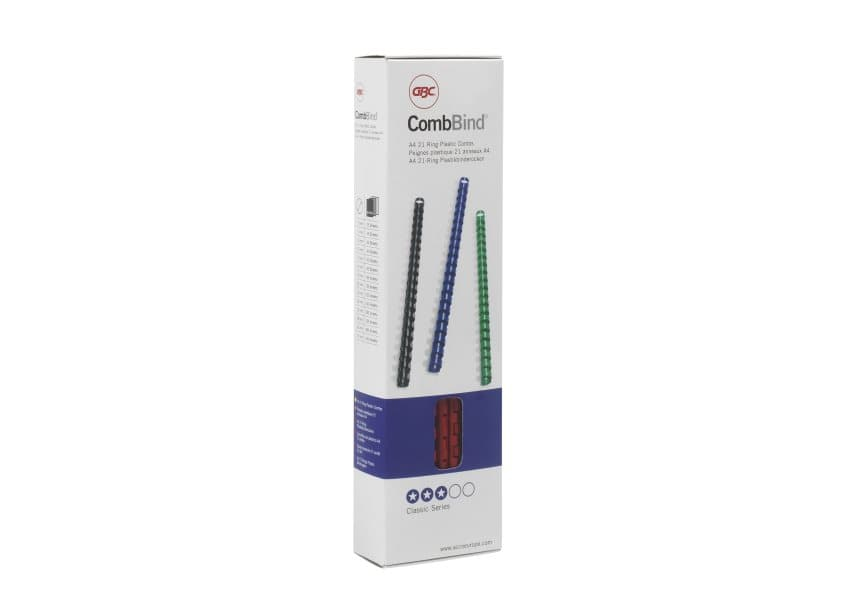 Binding doesn't get any easier! It’s easy to see why the GBC CombBind is our best selling binding spine. Whether you want to produce training manuals or internal reports, CombBind spines enable you to create stylishly bound, editable documents. With a CombBind spine, pages lie flat for convenient note taking and photocopying, and it’s simple to add or remove pages with the special ‘fast edit’ tool. These durable, plastic spines won't scratch, chip, peel or discolour and can be reused time after time. Colour: blue. 8mm comb. Up to 45 sheets A4 format. Pack size: 100.