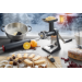 This multifunctional rotary grater with its three extra sharp LASER CUT drums transforms vegetables, fruit, chestnuts, cheese, chocolate and nuts into fine flakes or coarse chippings. Thin slices of cucumber or potato are also easy and safe to make. The grated or sliced material easily slides out of the conical drums. Safe insertion is guaranteed by a practical pusher. The extra high base allows even high-rimmed bowls to be placed underneath the rotary grater. A safe stand is ensured by a suction foot which can optionally be fastened to worktops or table tops up to 8 cm thick by means of a table clamp.