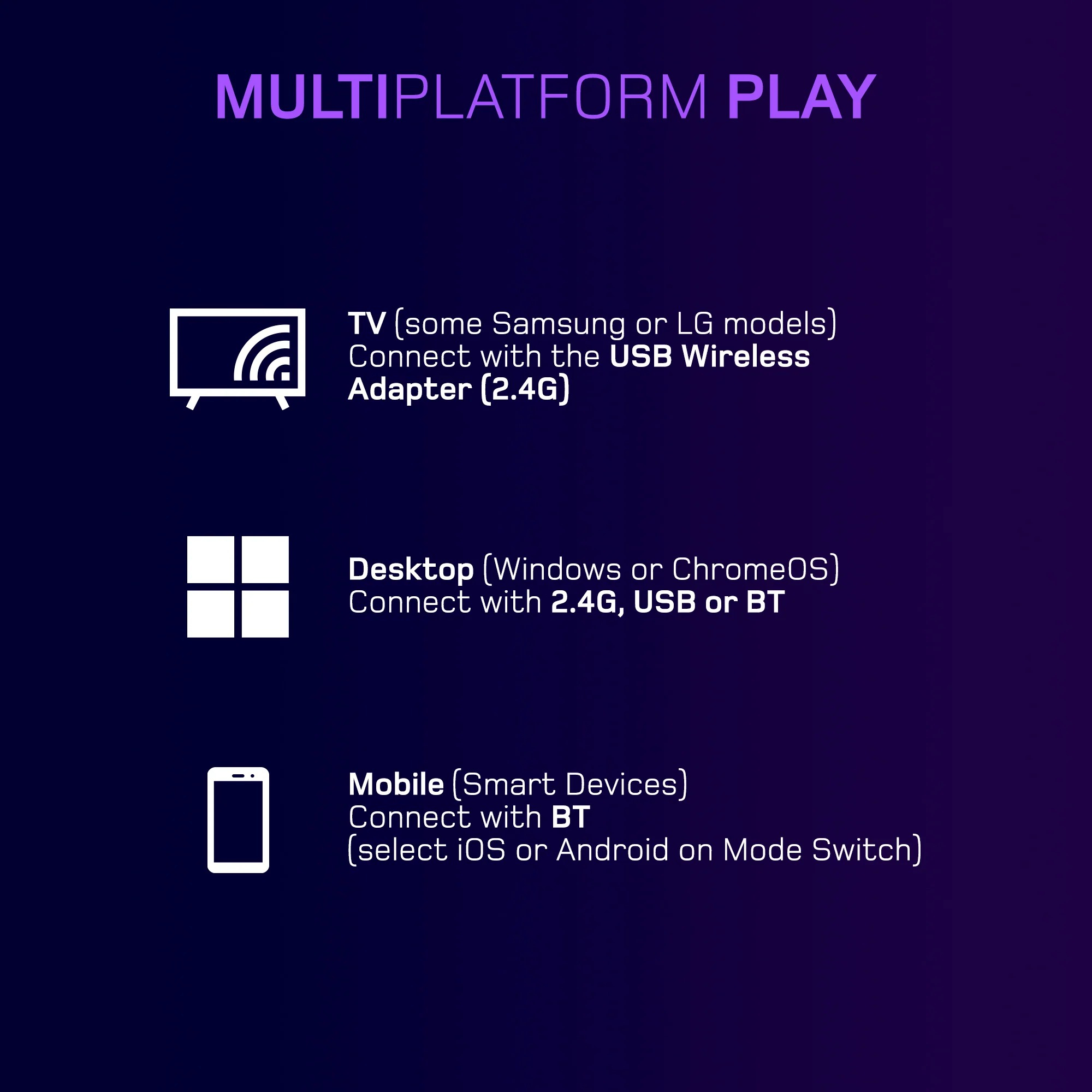 Gaming just got a little smarter with the Gioteck Smart TV Controller. Connect with ease and alternate between platforms with the flick of a switch. Packed with technology including dual-band low-latency wireless and automatic re-pairing you will always be game ready. Ergonomically designed with enhanced grips providing supreme comfort and personalised with your choice of RGB colours makes your truly stand out from the crowd.