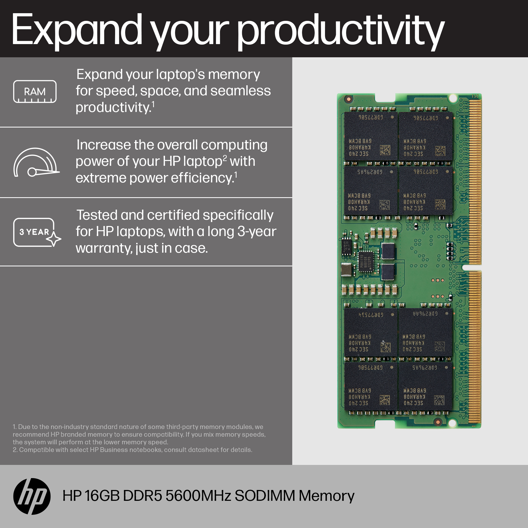 Upgrading to 16 GB DDR5 5600MHz SODIMM doesn't just expand your RAM, it increases the overall computing power of your HP laptop—opening the floodgates of speed and giving every part more room to think[1]. It's also extremely efficient, so all that power doesn't drain your battery faster or heat everything up.