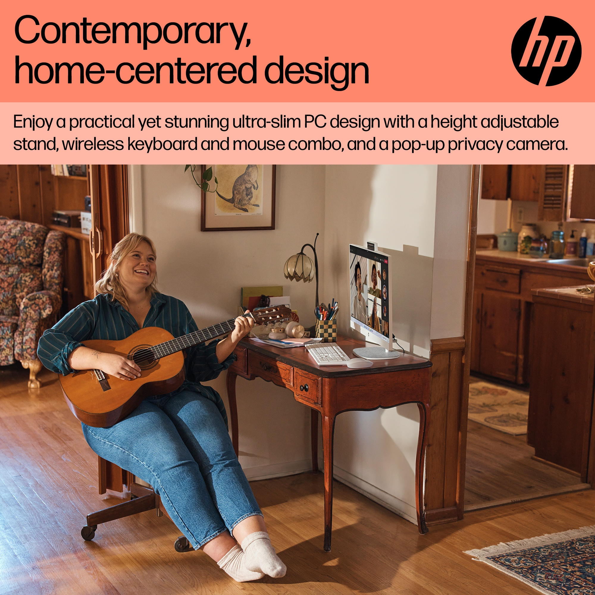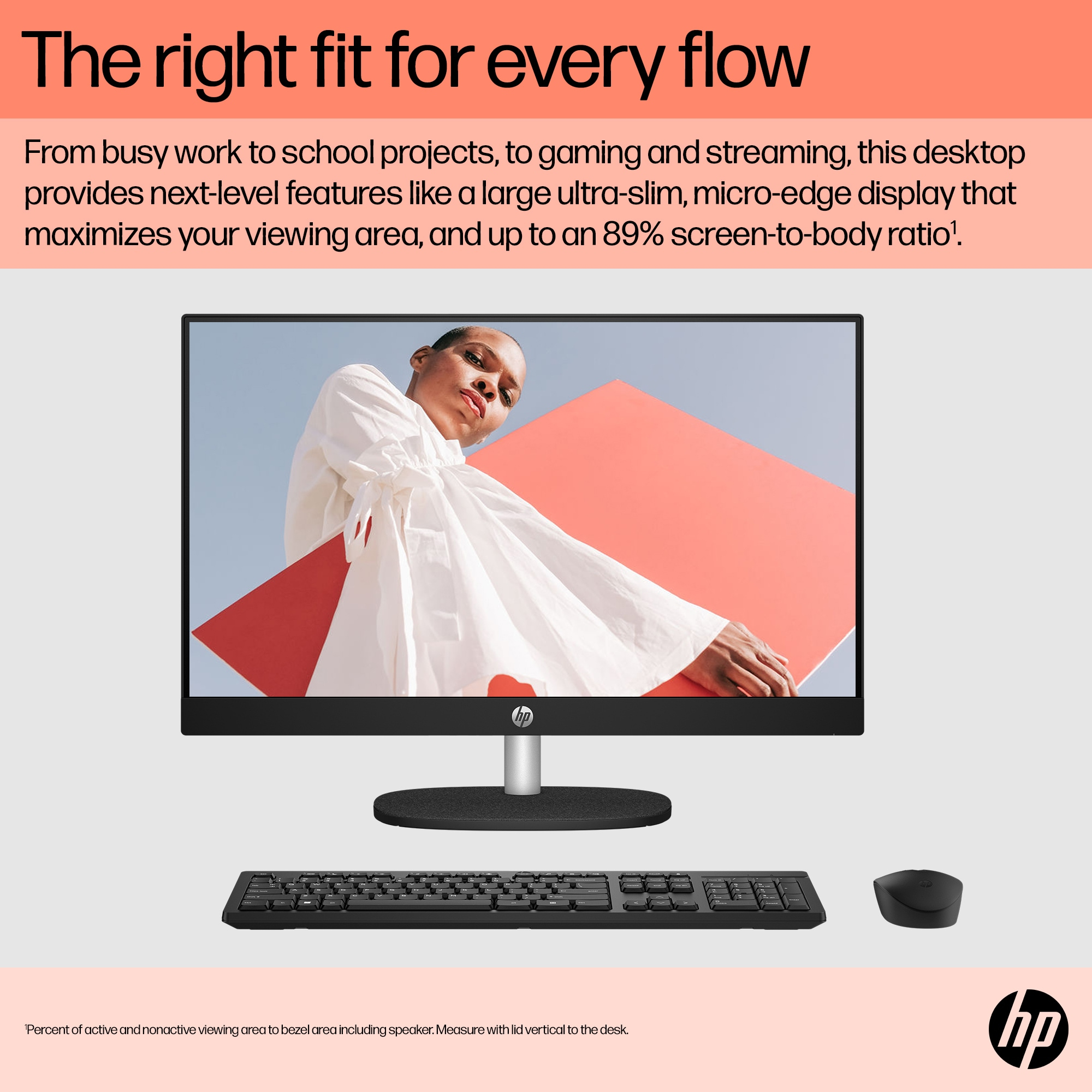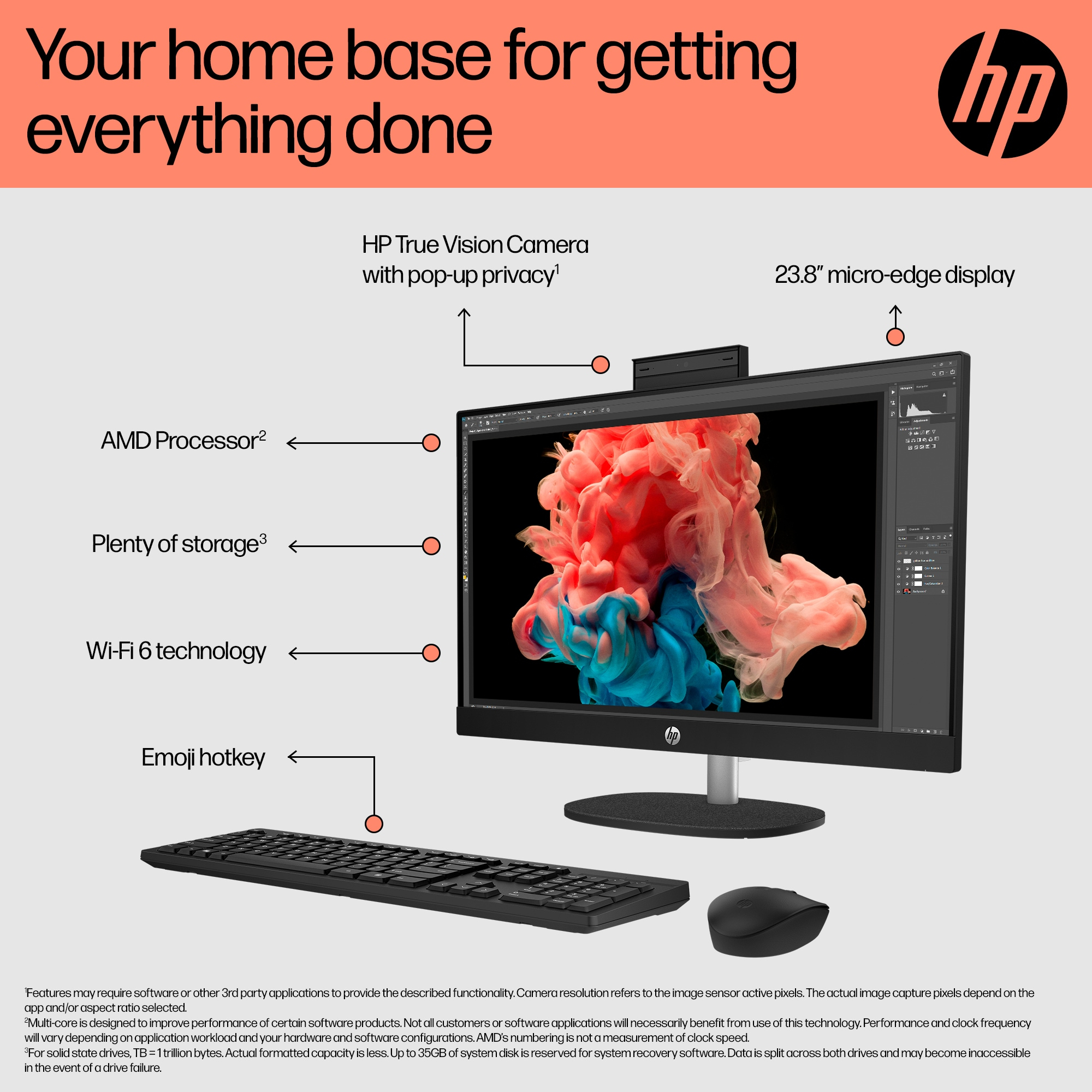 This slim, HP 23.8" All-in-One Desktop PC empowers you to do more while using less. Responsibly manufactured using post-consumer recycled and ocean-bound plastics[1] and is EPEAT Gold Registered and ENERGY STAR Certified[2]. With a powerful processor, upgraded memory and enhanced multitasking features, there’s no compromise for heightened performance.