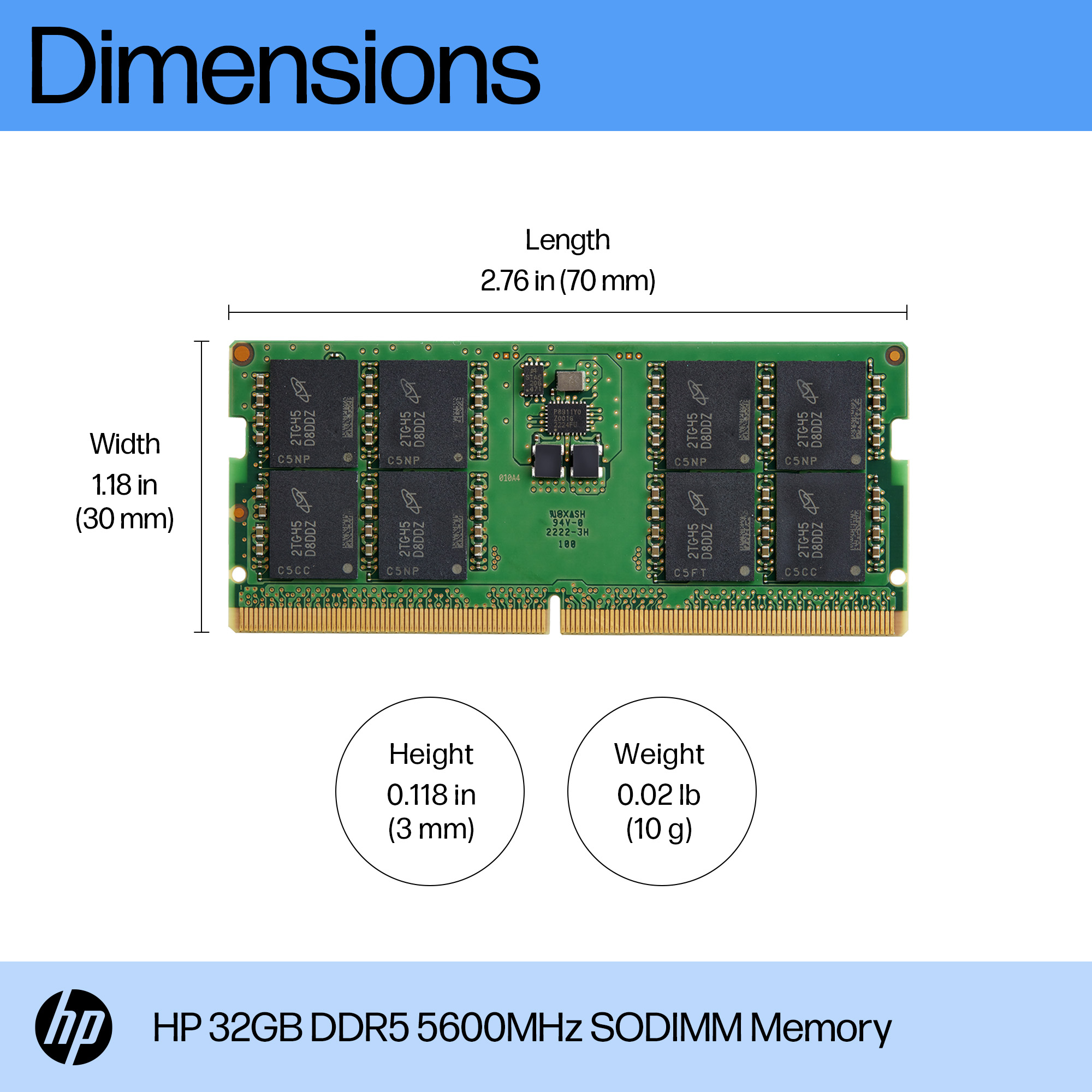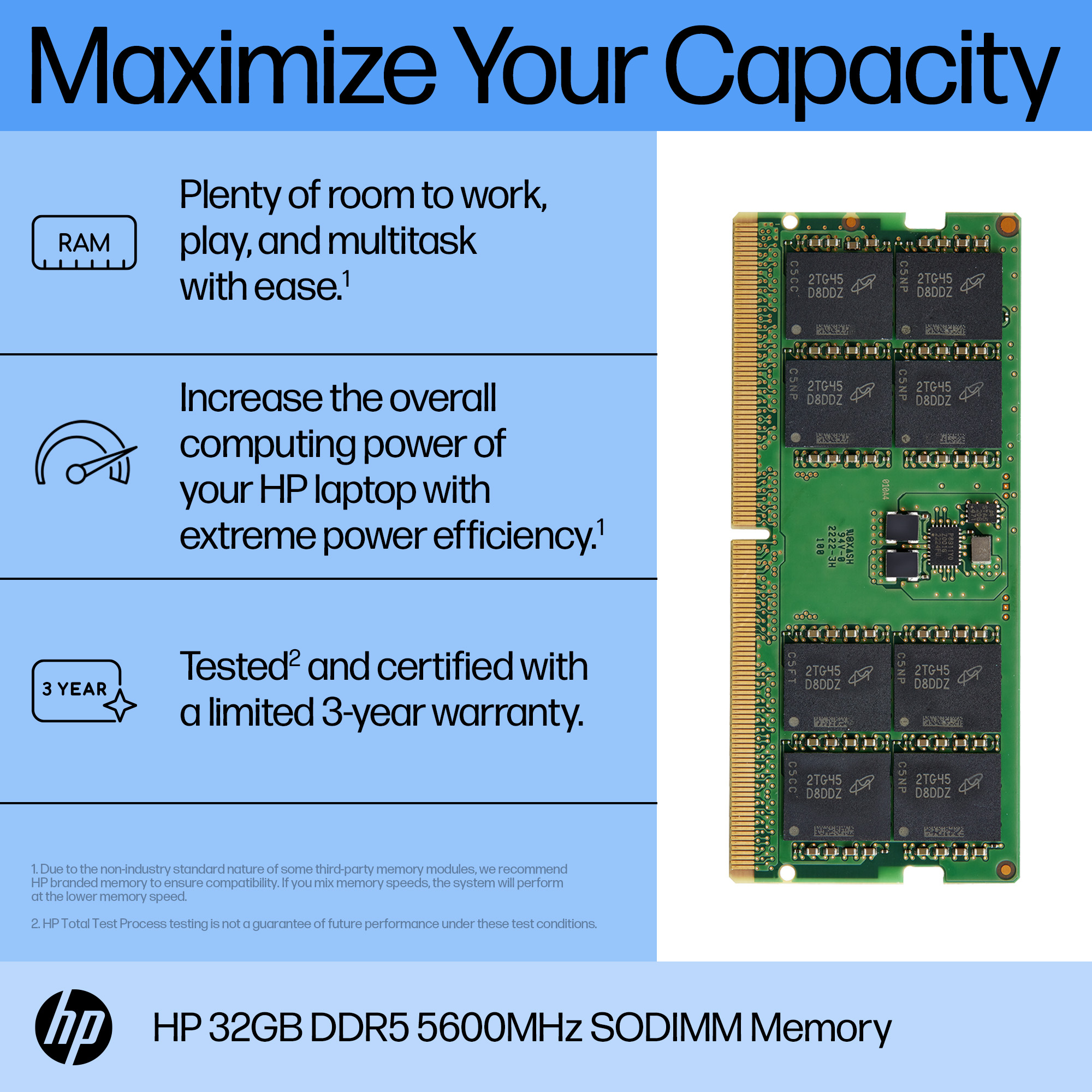 Upgrading to 32 GB DDR5 5600MHz SODIMM doesn't just expand your RAM, it increases the overall computing power of your HP laptop—opening the floodgates of speed and giving every part more room to think. It's also extremely efficient, so all that power doesn't drain your battery faster or heat everything up.