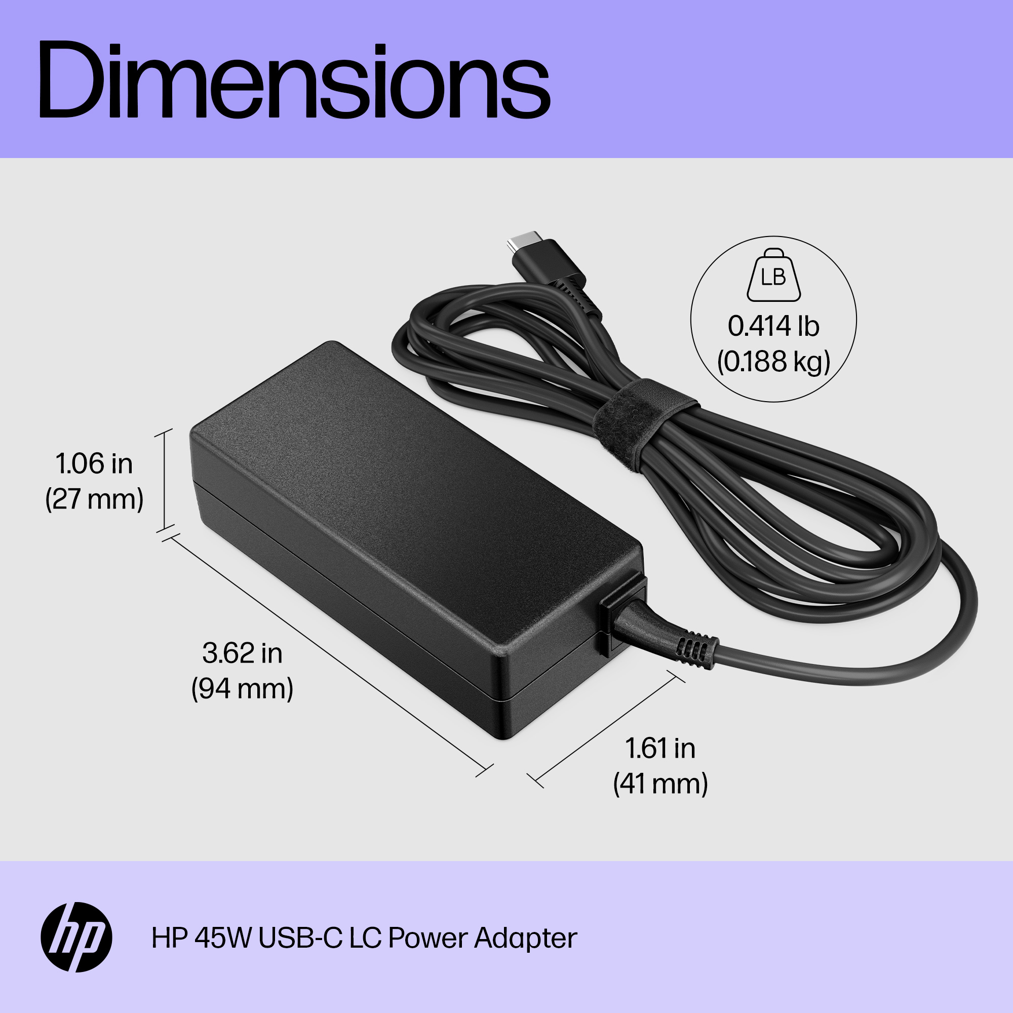 Power and charge your HP Chromebook[1] from its USB-C port with the HP 45W USB-C LC Power Adapter.