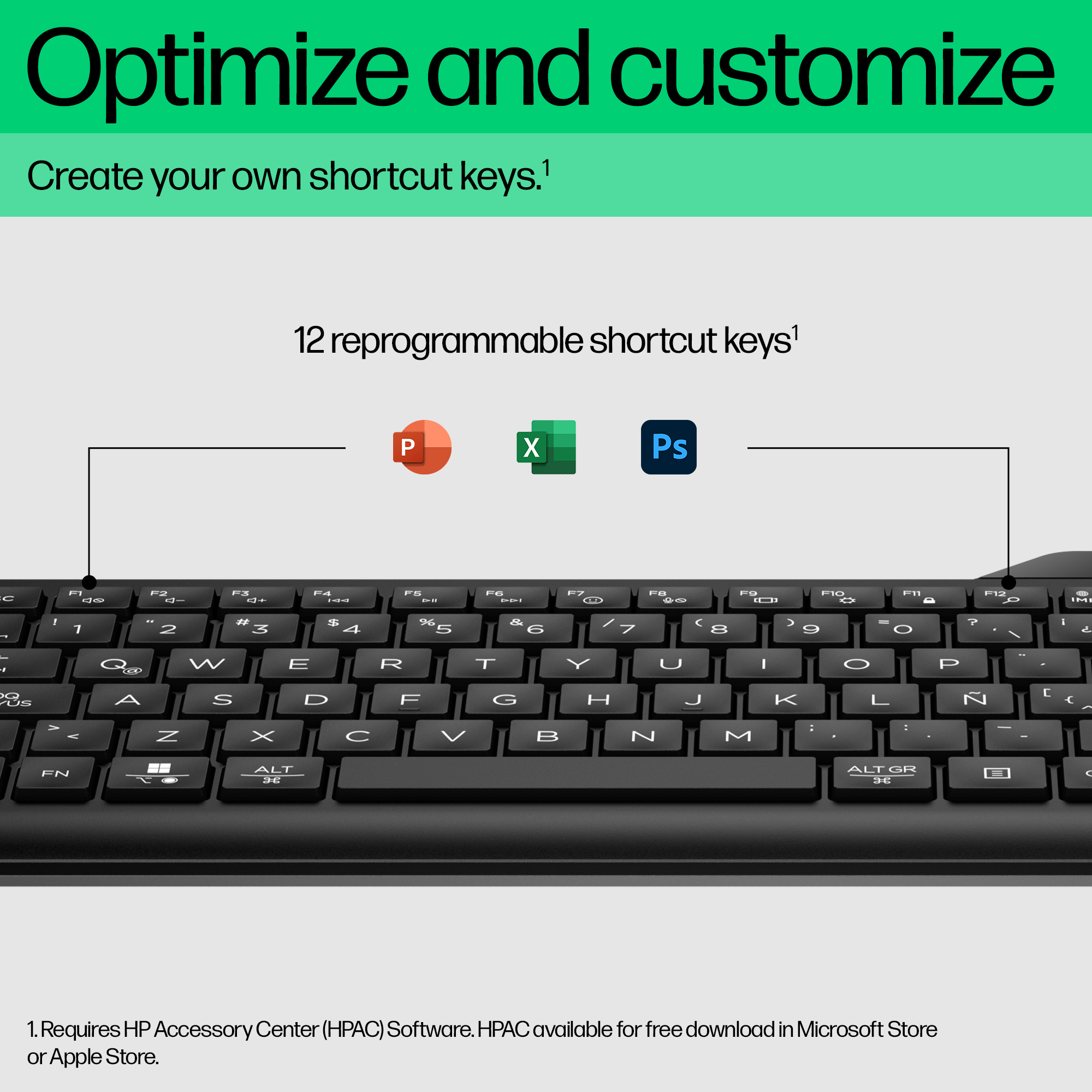 Go further with more flexibility. Whether for office tasks or game play, program the F1–F12 keys<sup>[1]</sup> to act as custom shortcuts, or automate difficult keystroke combinations to make all your moves in a fraction of the time. HP Accessory Center software makes it easy to set and change commands on the fly.