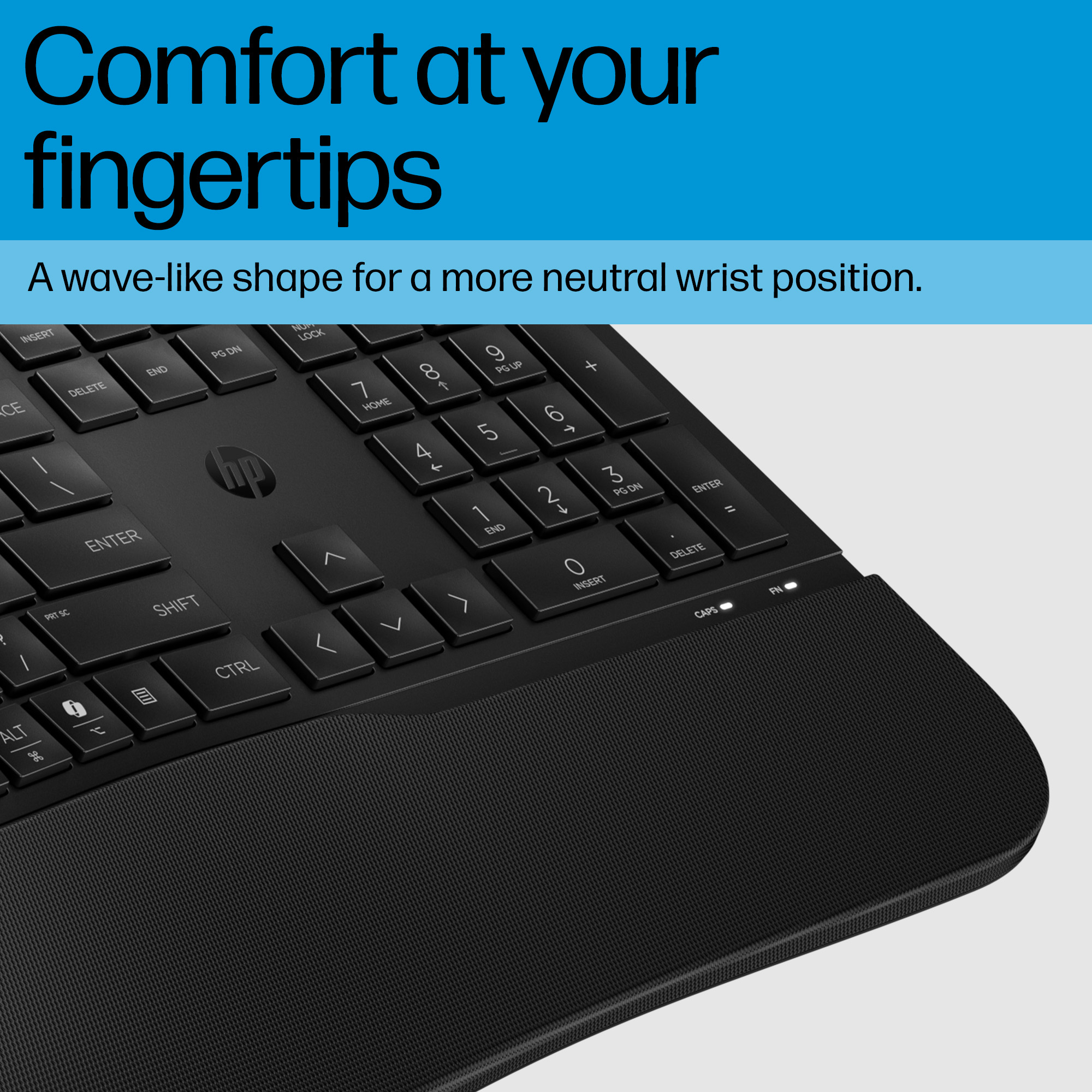 From blogging to coding, the HP 485 Comfort Wired Keyboard is designed for natural comfort and all-day productivity. Its familiar layout delivers optimal comfort through a wave-like shape, quiet keycaps, and a soft cushioned wrist rest.