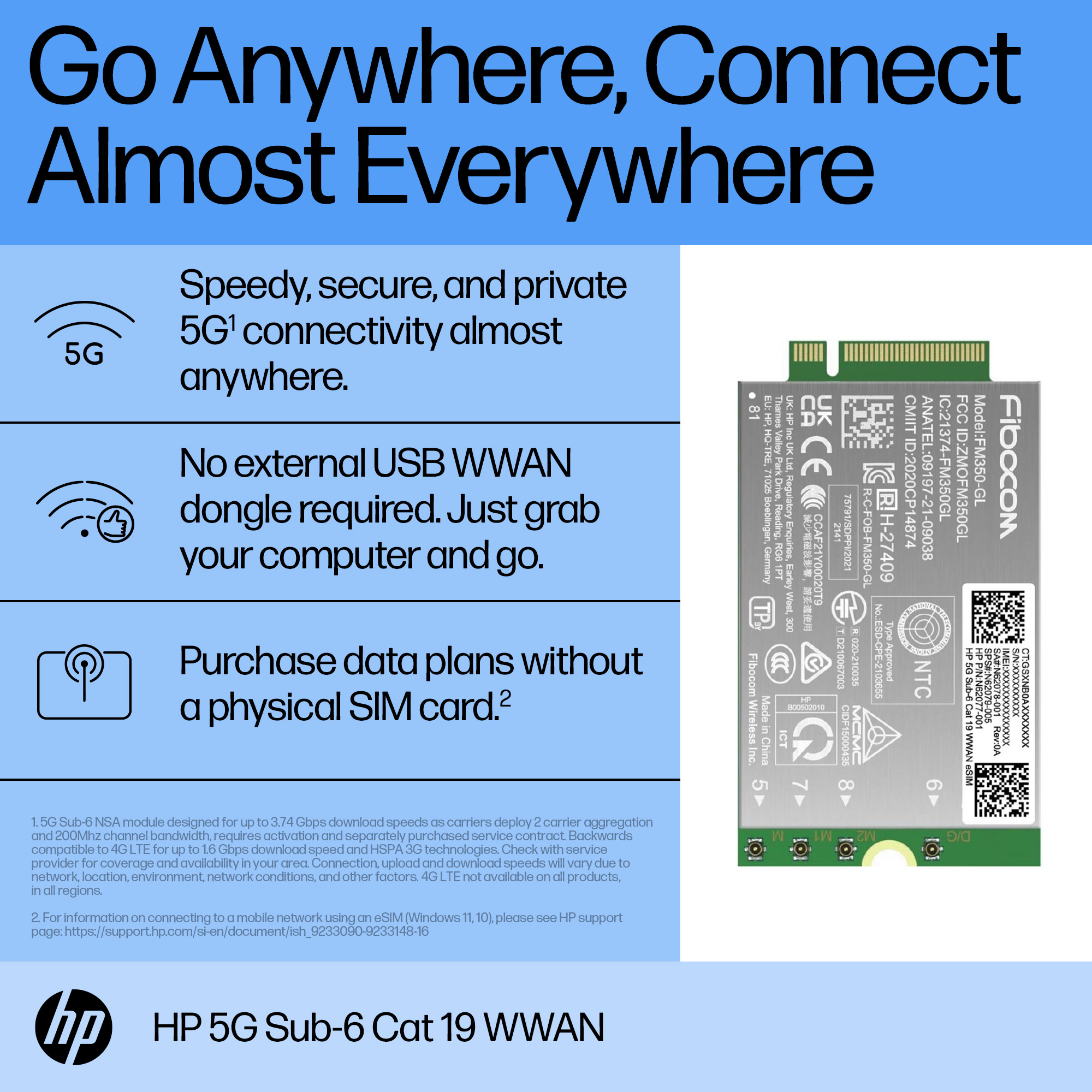 You need the internet...now, here, there, and everywhere. Stay connected swiftly and securely over 5G networks at gigabit speed with optimized power consumption.[1] The HP 5G Sub-6 Cat 19 WWAN delivers dedicated broadband to select HP Business Notebooks. Now the world is truly within reach.