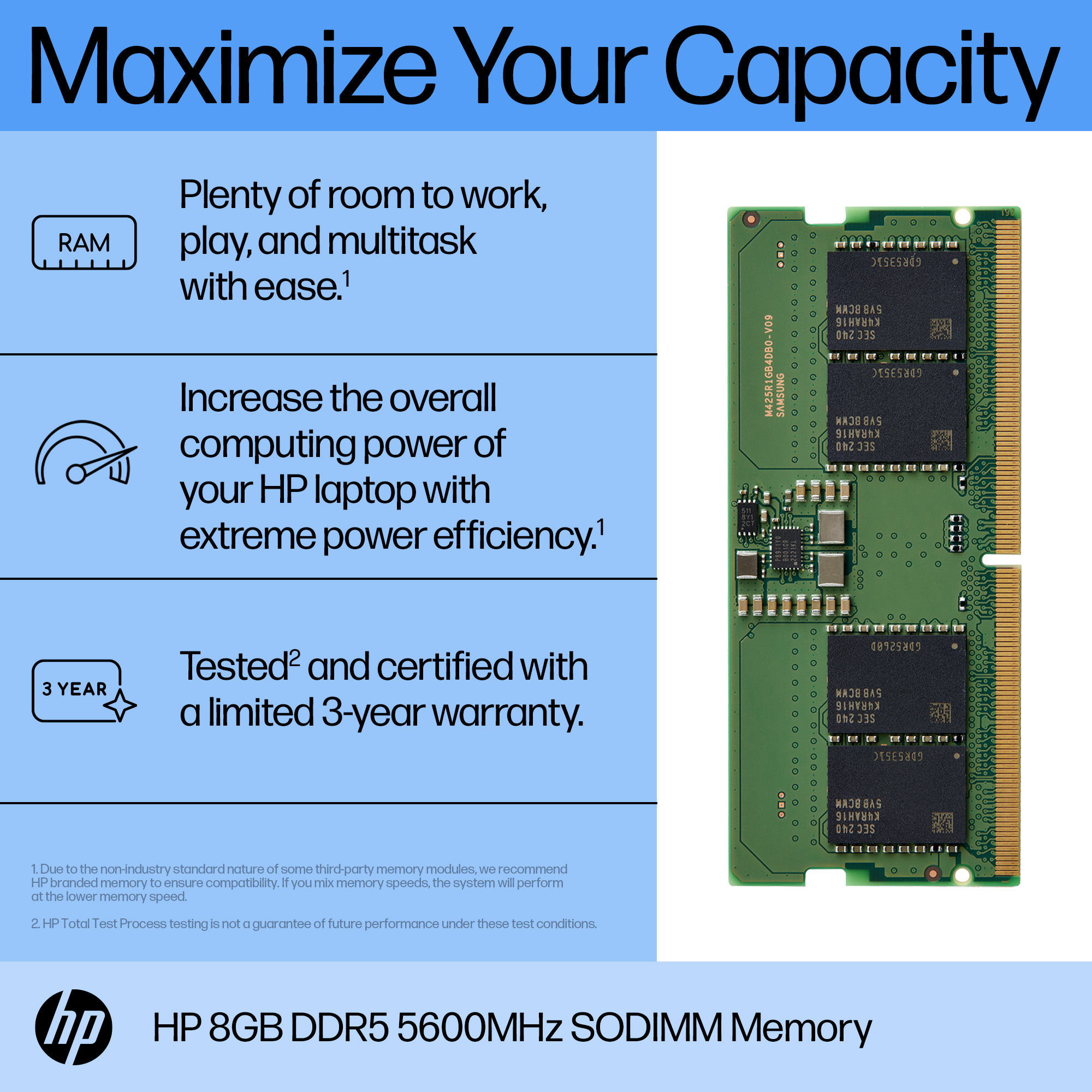 Upgrading to 8 GB DDR5 5600MHz SODIMM doesn't just expand your RAM, it increases the overall computing power of your HP laptop—opening the floodgates of speed and giving every part more room to think[1]. It's also extremely efficient, so all that power doesn't drain your battery faster or heat everything up.