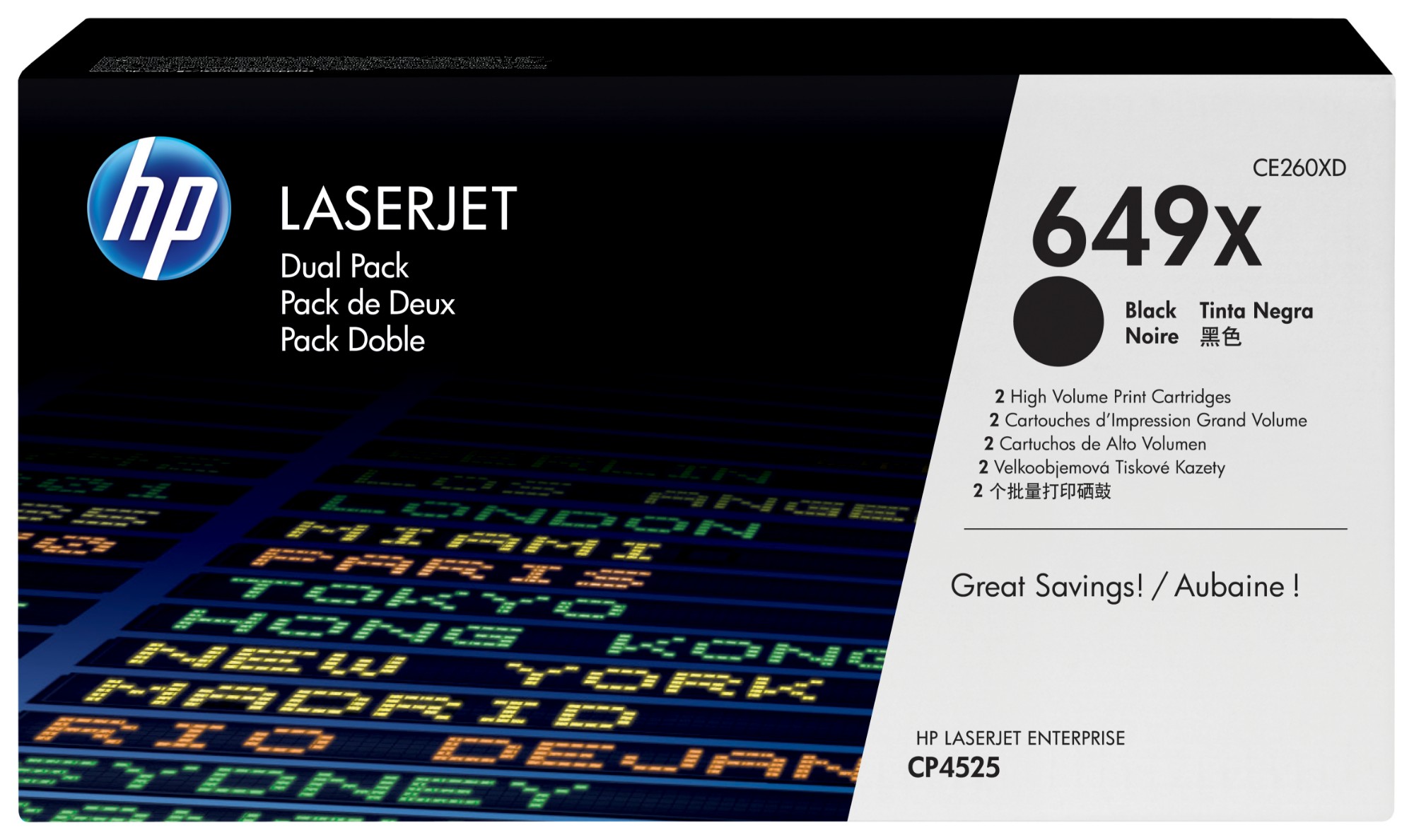 HP 649X Black Dual Pack LaserJet Toner Cartridges offer better value than individual cartridges. Produce more pages for a lower price and simplify ordering with two cartridges packaged together. Print professional-quality documents that impress.
