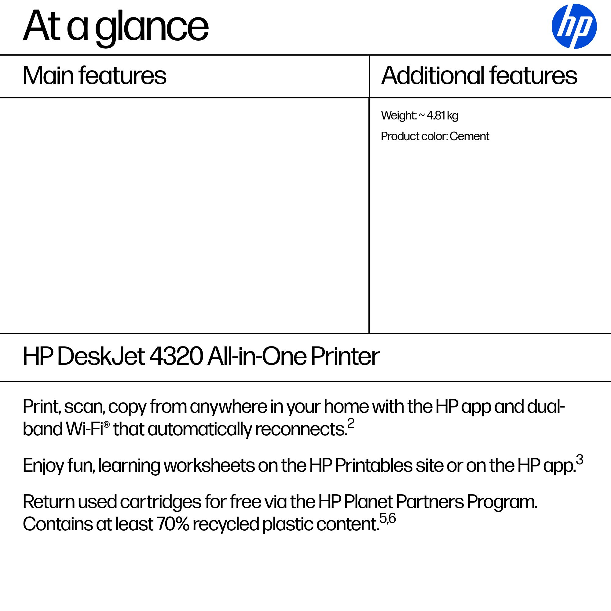 | Box contents | HP DeskJet 4320 All-in-One Printer; HP 308 Setup Black Cartridge; HP 308 Setup Tri-Color Cartridge; Regulatory flyer; Setup guide; Reference guide; Power cord [For ink volume and page yield information, visit http://hp.com/go/learnaboutsupplies] |