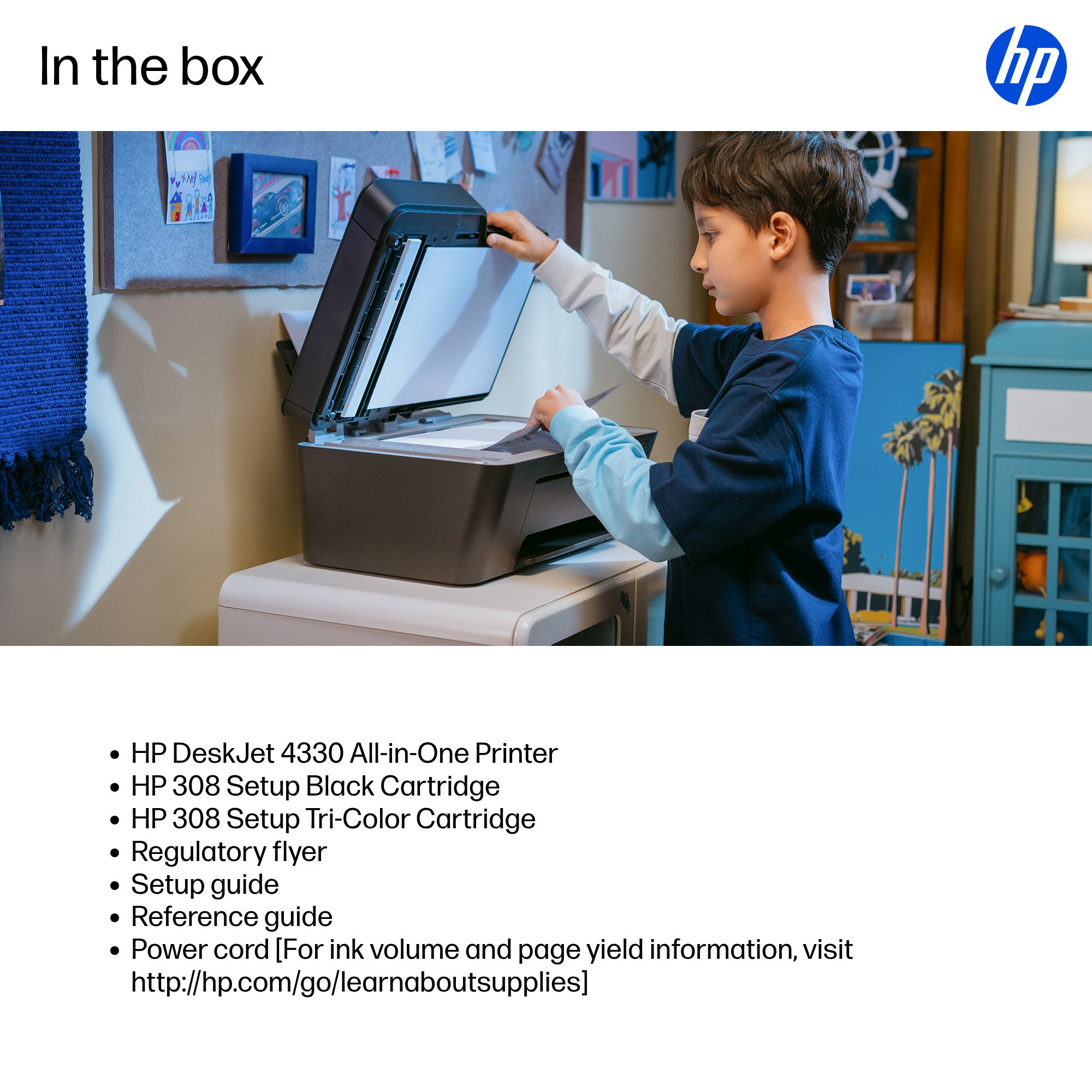 | Box contents | HP DeskJet 4330 All-in-One Printer; HP 308 Setup Black Cartridge; HP 308 Setup Tri-Color Cartridge; Regulatory flyer; Setup guide; Reference guide; Power cord [For ink volume and page yield information, visit http://hp.com/go/learnaboutsupplies] |