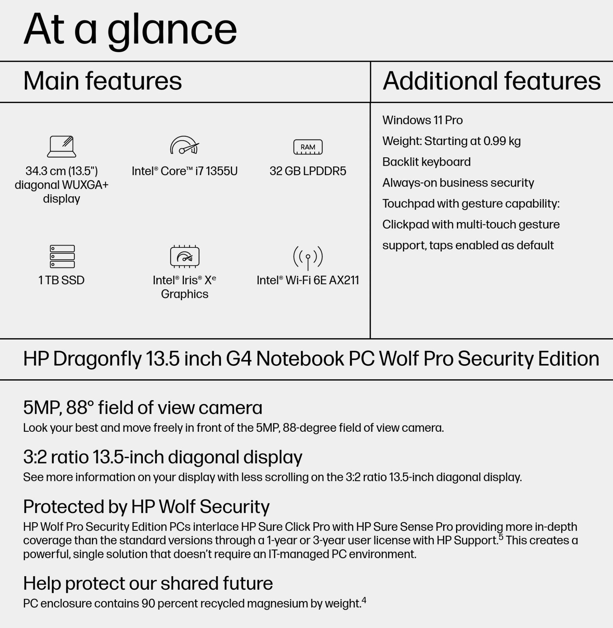 Power your personal brand with the HP Dragonfly. This beautifully designed PC utilizes the latest Intel Core™ processor[2], provides audio and video experiences enhanced by HP Presence[3], enclosures made from 90 percent recycled magnesium[4], and helps keep you protected with HP Wolf Security.[5]