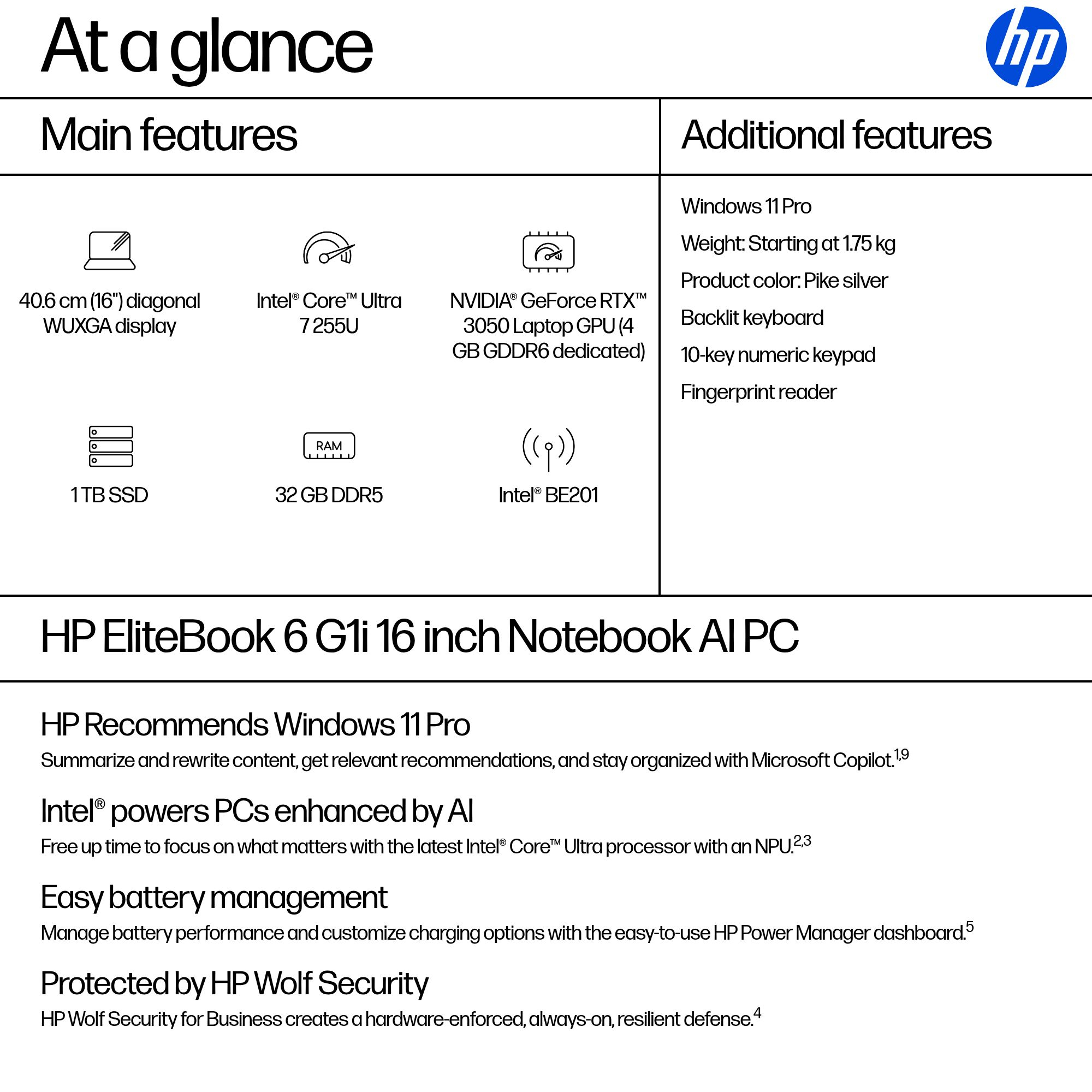 AI-based experiences and modern connectivity enhance user productivity. The HP EliteBook 6 G1i AI 16 inch PC offers an 11 TOPS NPU[3], enterprise-grade security and manageability in a highly configurable PC that meets the demanding needs of enterprise users.