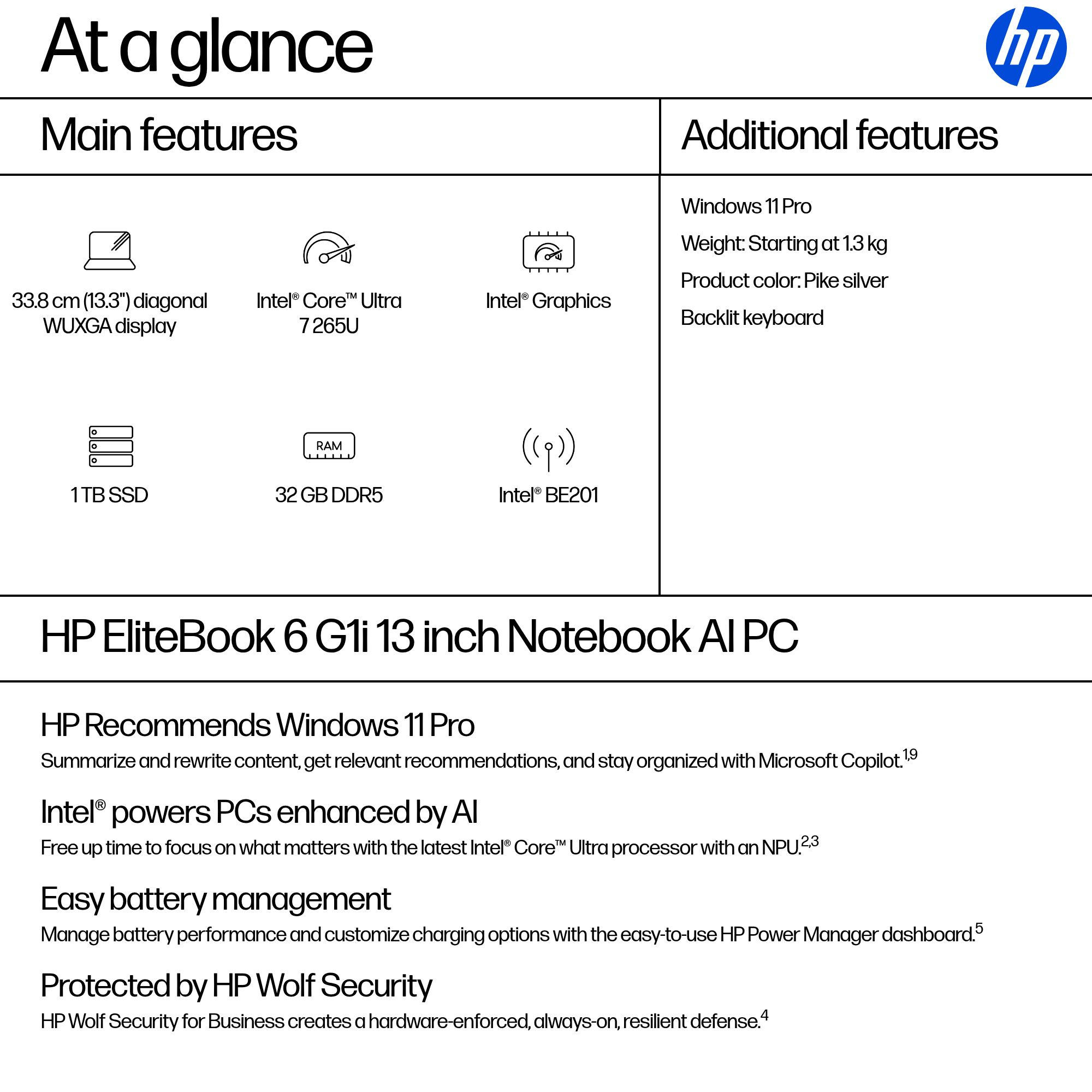 HP EliteBook 6 G1i AI PC Intel Core Ultra 7 265U Laptop 33.8 cm (13.3") WUXGA 32 GB DDR5-SDRAM 1 TB SSD Wi-Fi 7 (802.11be) Windows 11 Pro Silver
