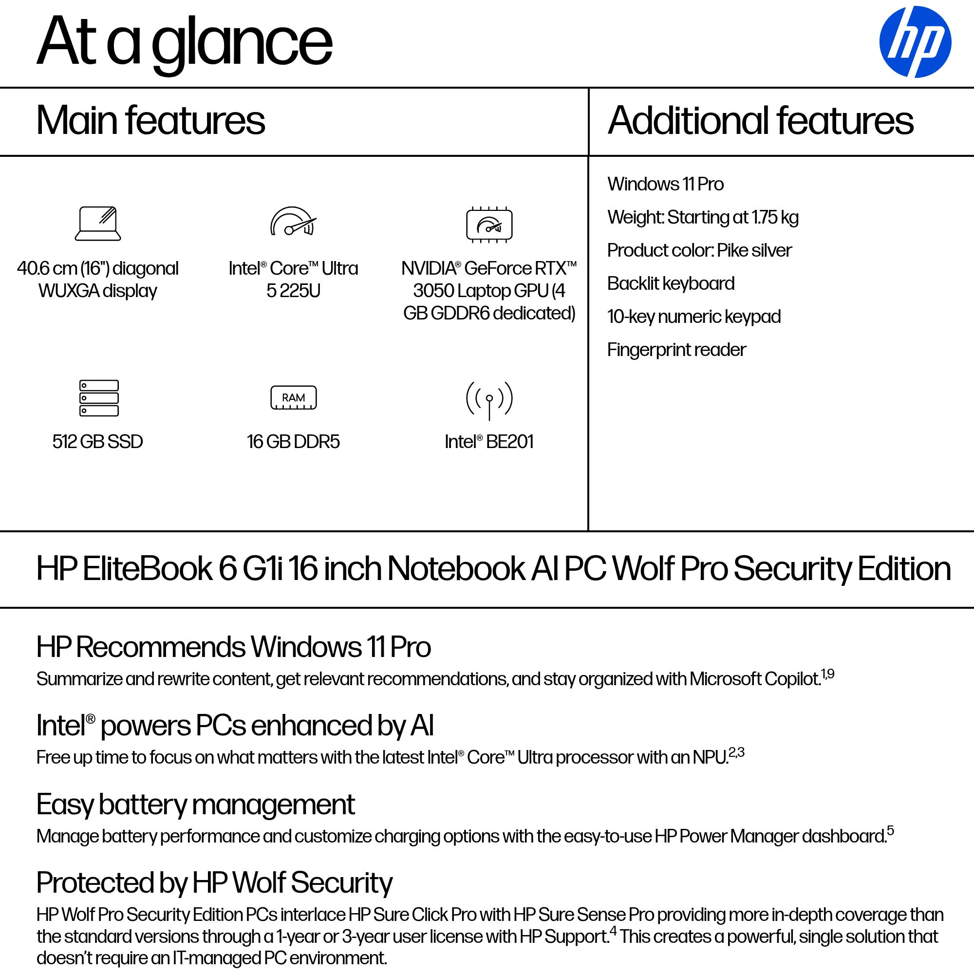 AI-based experiences and modern connectivity enhance user productivity. The HP EliteBook 6 G1i AI 16 inch PC offers an 11 TOPS NPU[3], enterprise-grade security and manageability in a highly configurable PC that meets the demanding needs of enterprise users.